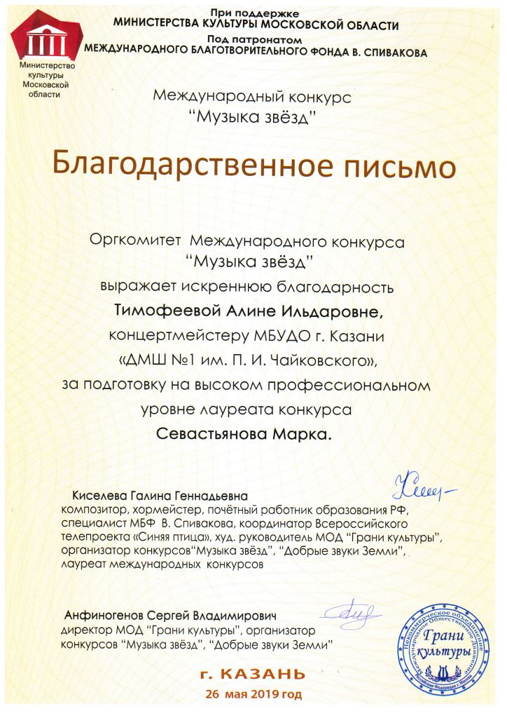 Международный конкурс "Музыка звёзд" - Благодарственное письмо Тимовеевой А.И.;