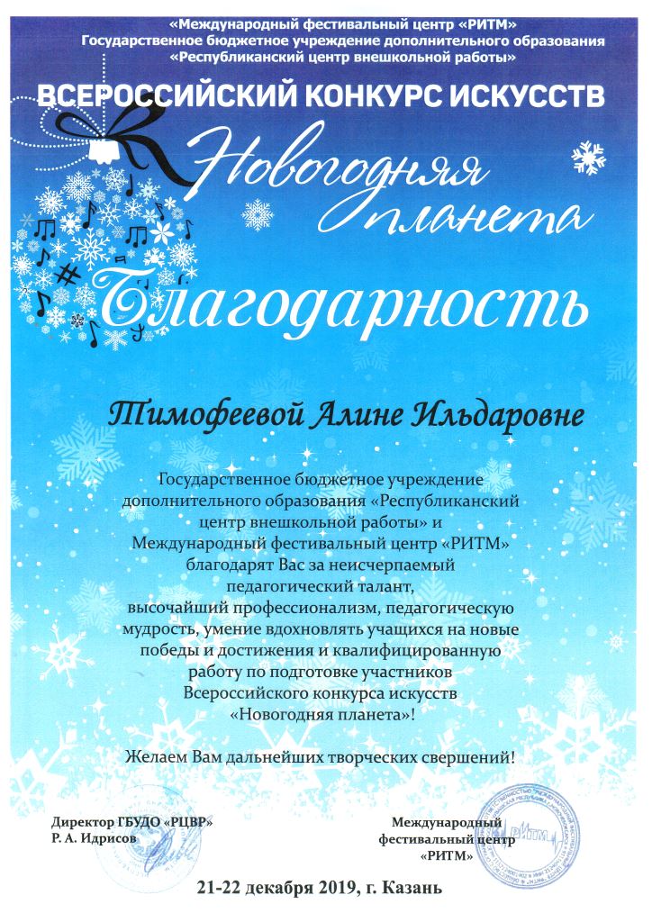 Всероссийский конкурс искусств "Новогодняя планета" - Благодарность Тимофеевой А.И.;