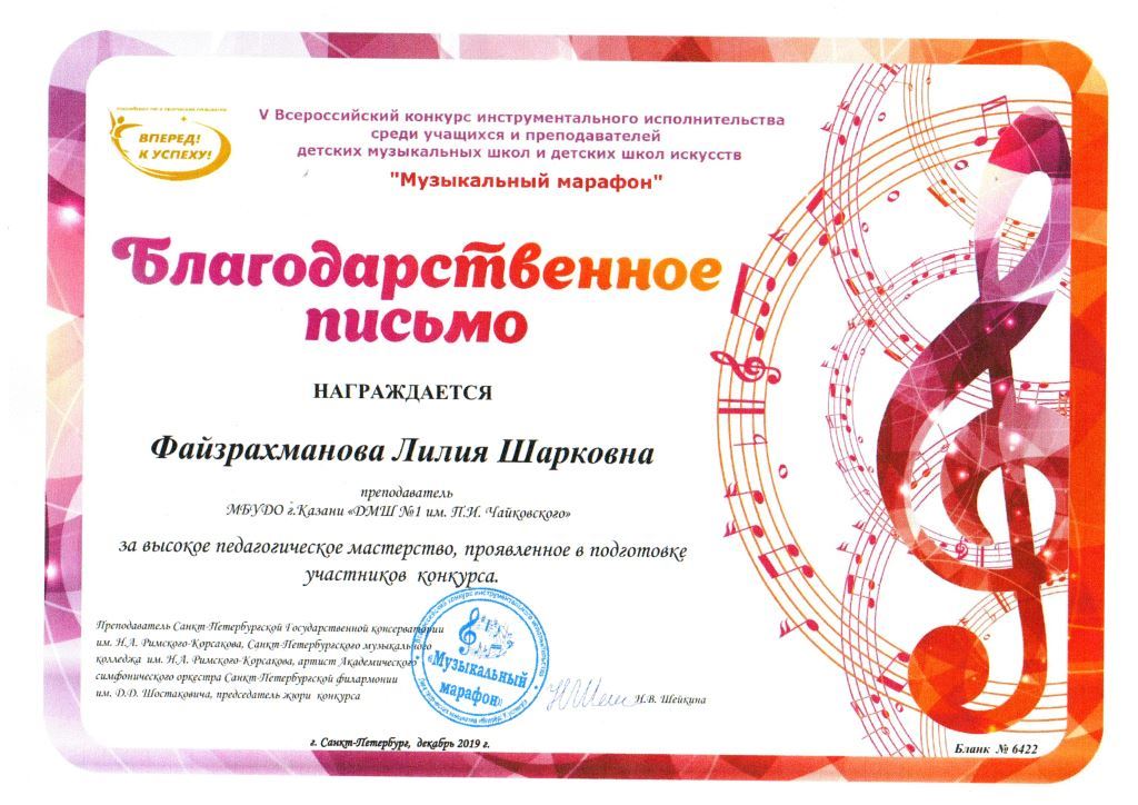V Всероссийский конкурс инструментального исполнительства среди учащихся и преподавателей ДМШ и ДШИ "Музыкальный марафон" - Благодарственное письмо Файзерахмановой Л.Ш.;