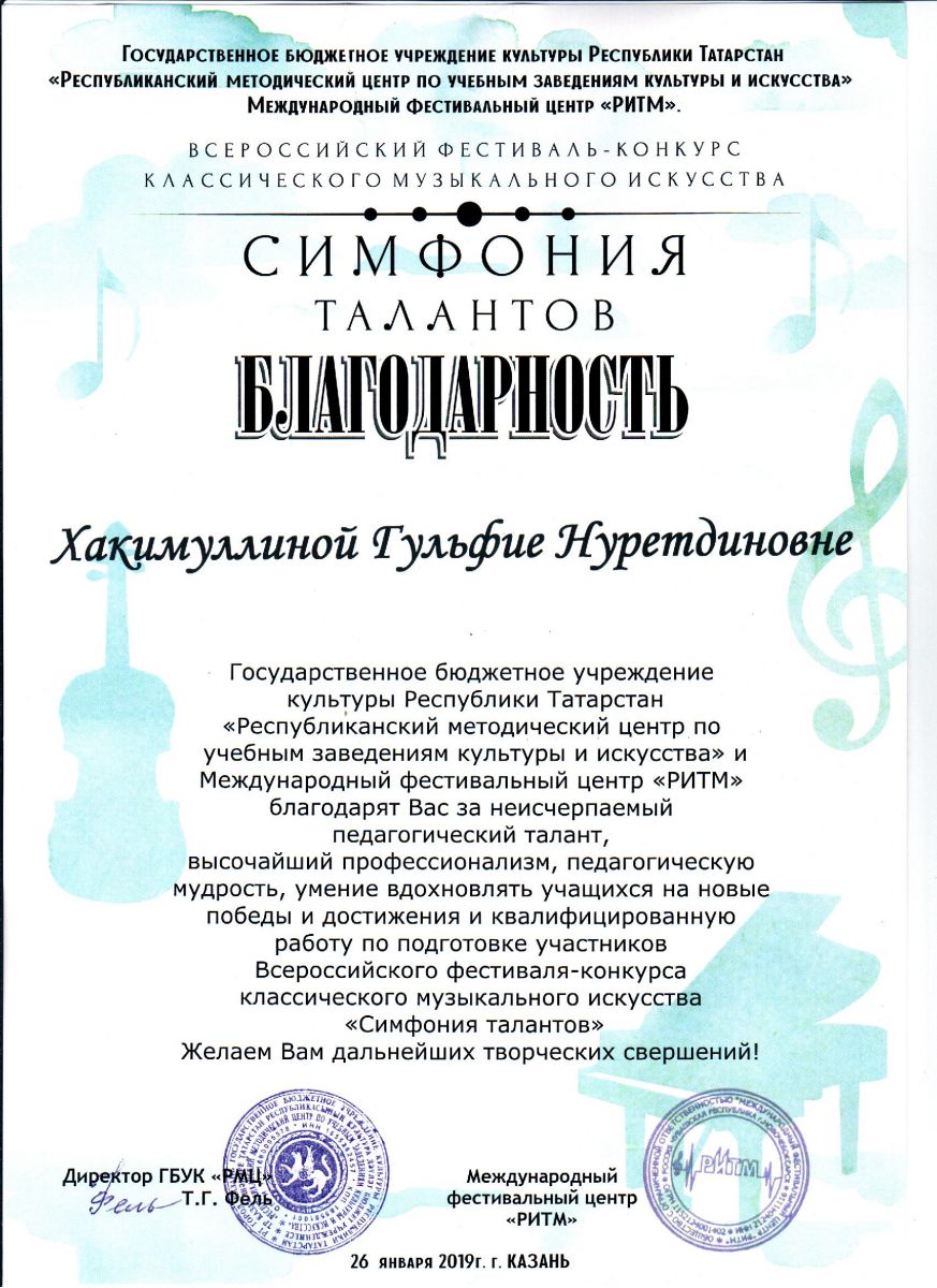 Всероссийский фестиваль-конкурс классического музыкального искусства "Симфония талантов" - Хакимуллинf Г.Н., Благодарность;