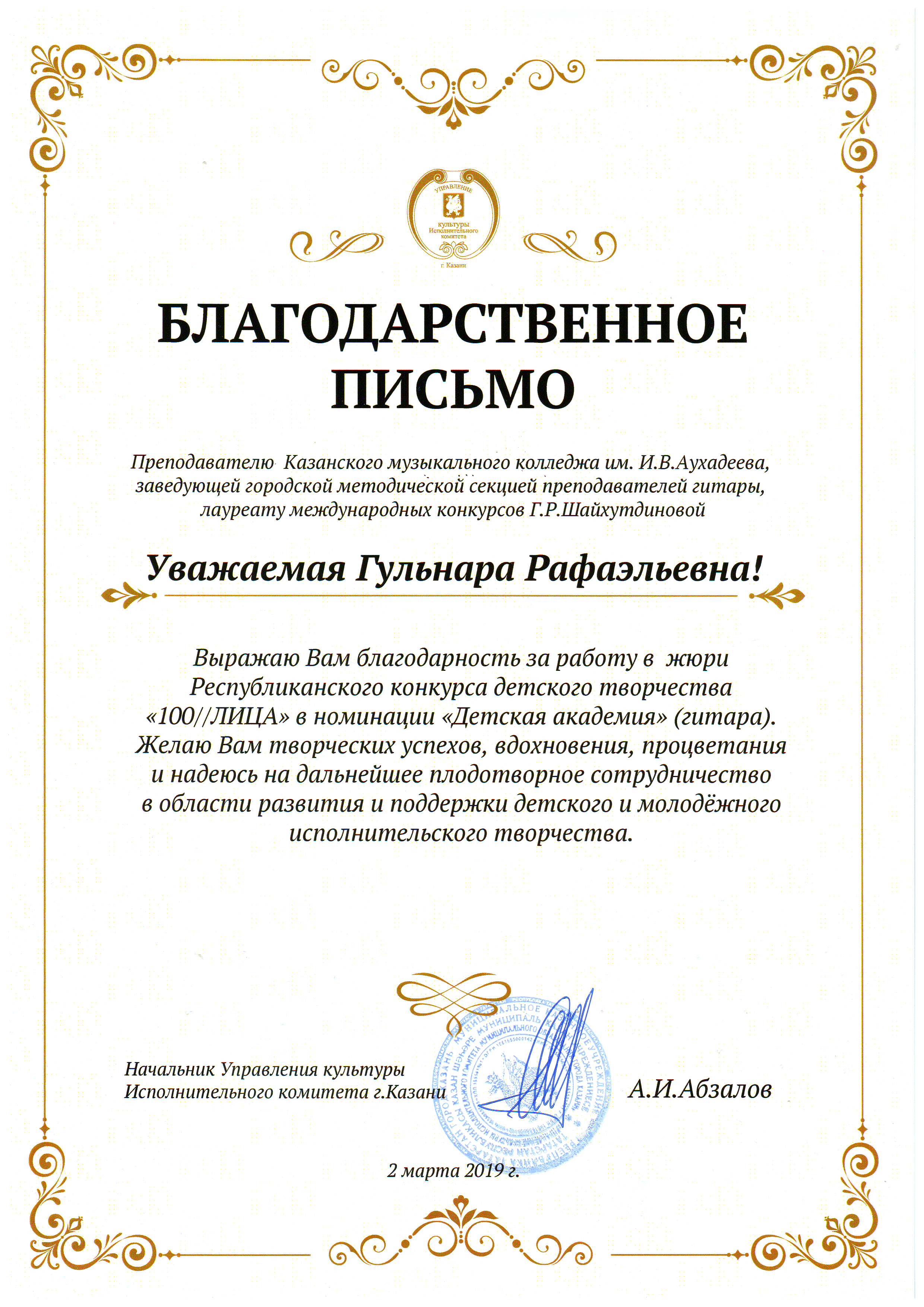 Республиканский конкурс детского творчества "100//ЛИЦА" в номинации "Детская академия" (гитара) - Шайхутдинова Г.Р., Благодарность за работу в составе жюри;