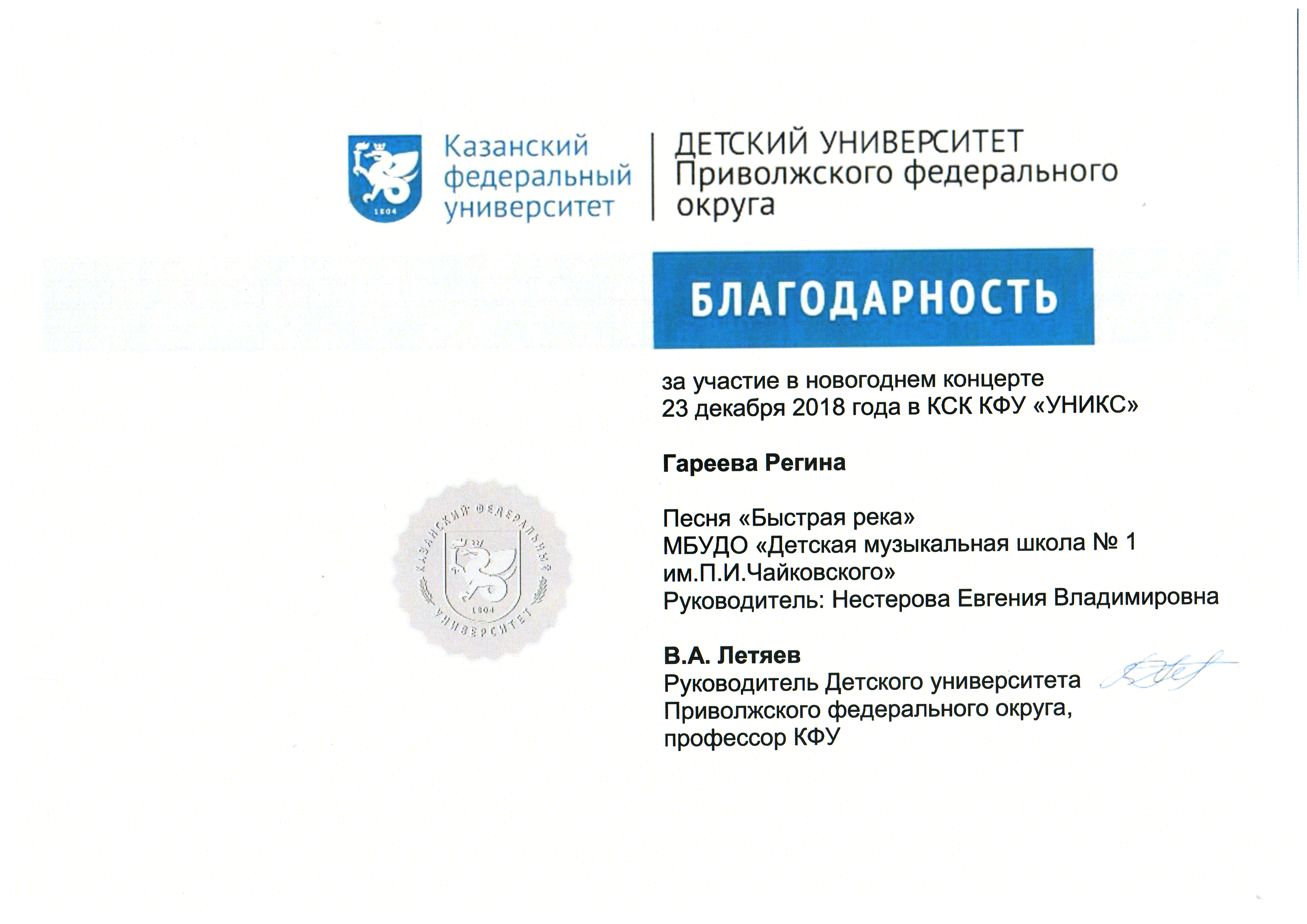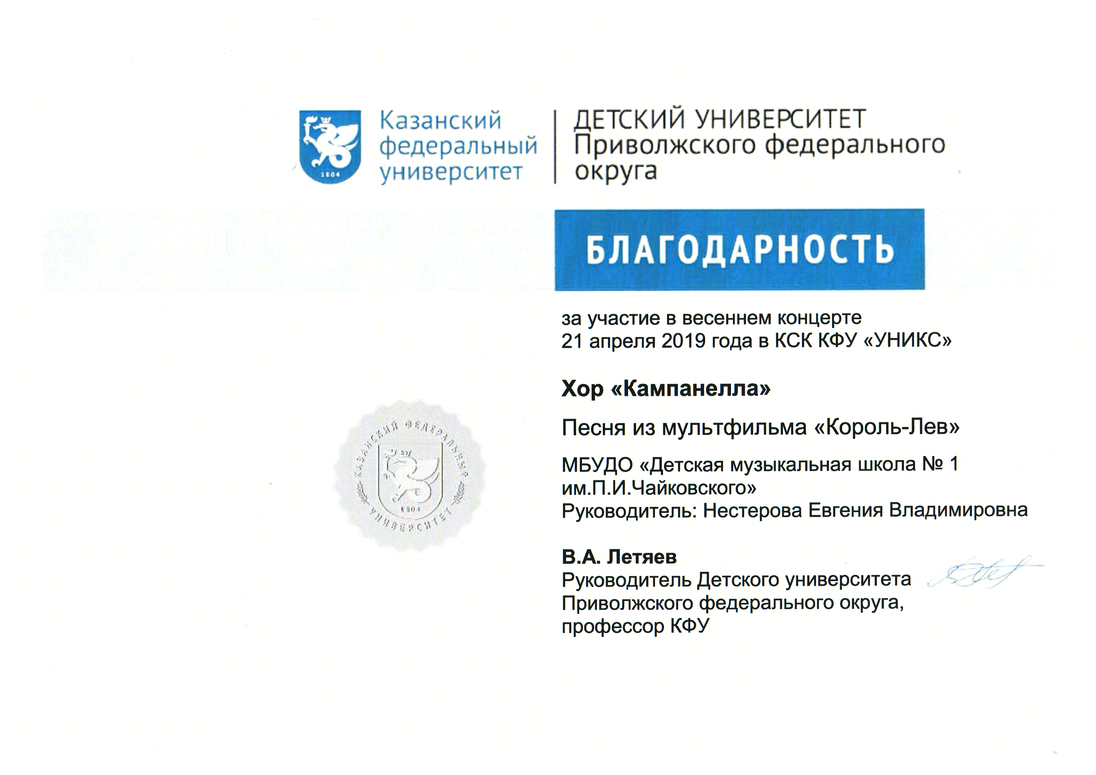 Детский Университет Приволжского федерального округа - Благодарность за участие в проведении мастер-класса "Как оркестр рождает музыку" -