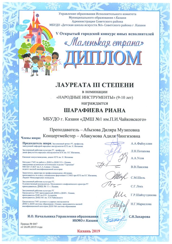 V Открытый городской конкурс юных исполнителей "Маленькая страна" - Шарафиева Риана, Лауреат III степени, класс Абызовой Д.М., концертмейстер Абакумова А.Ч.;