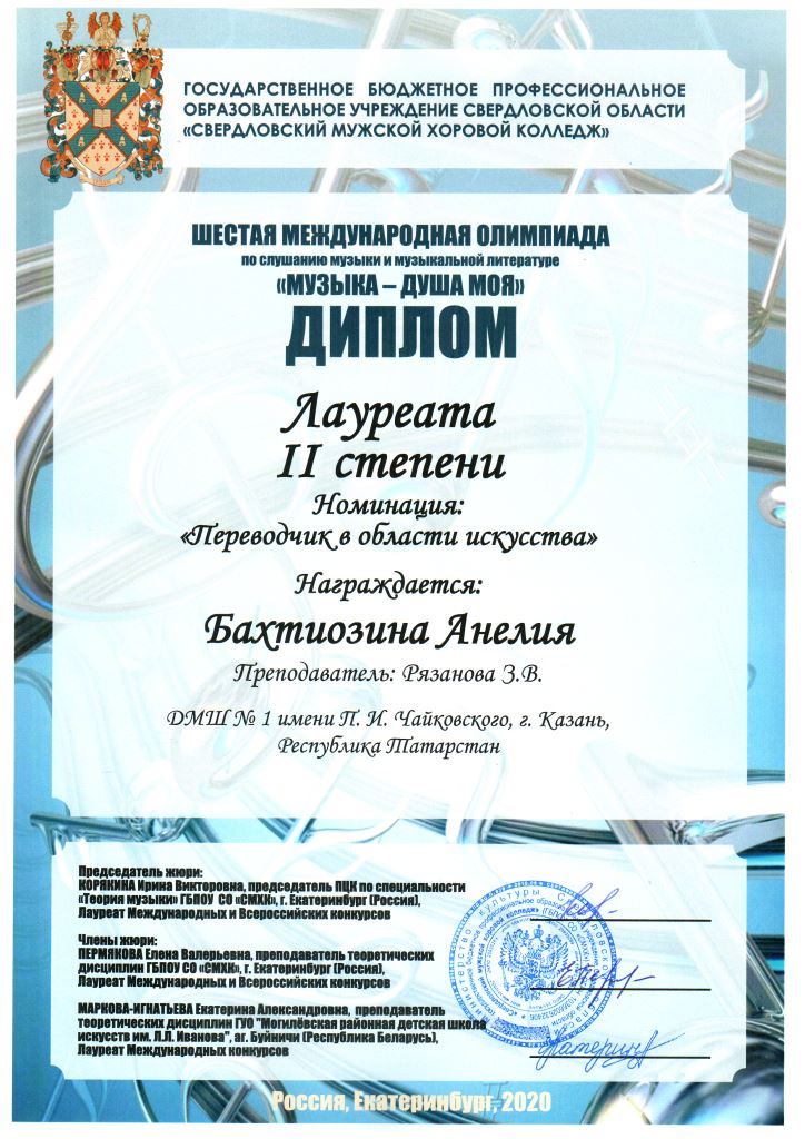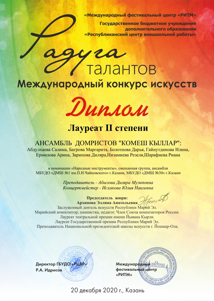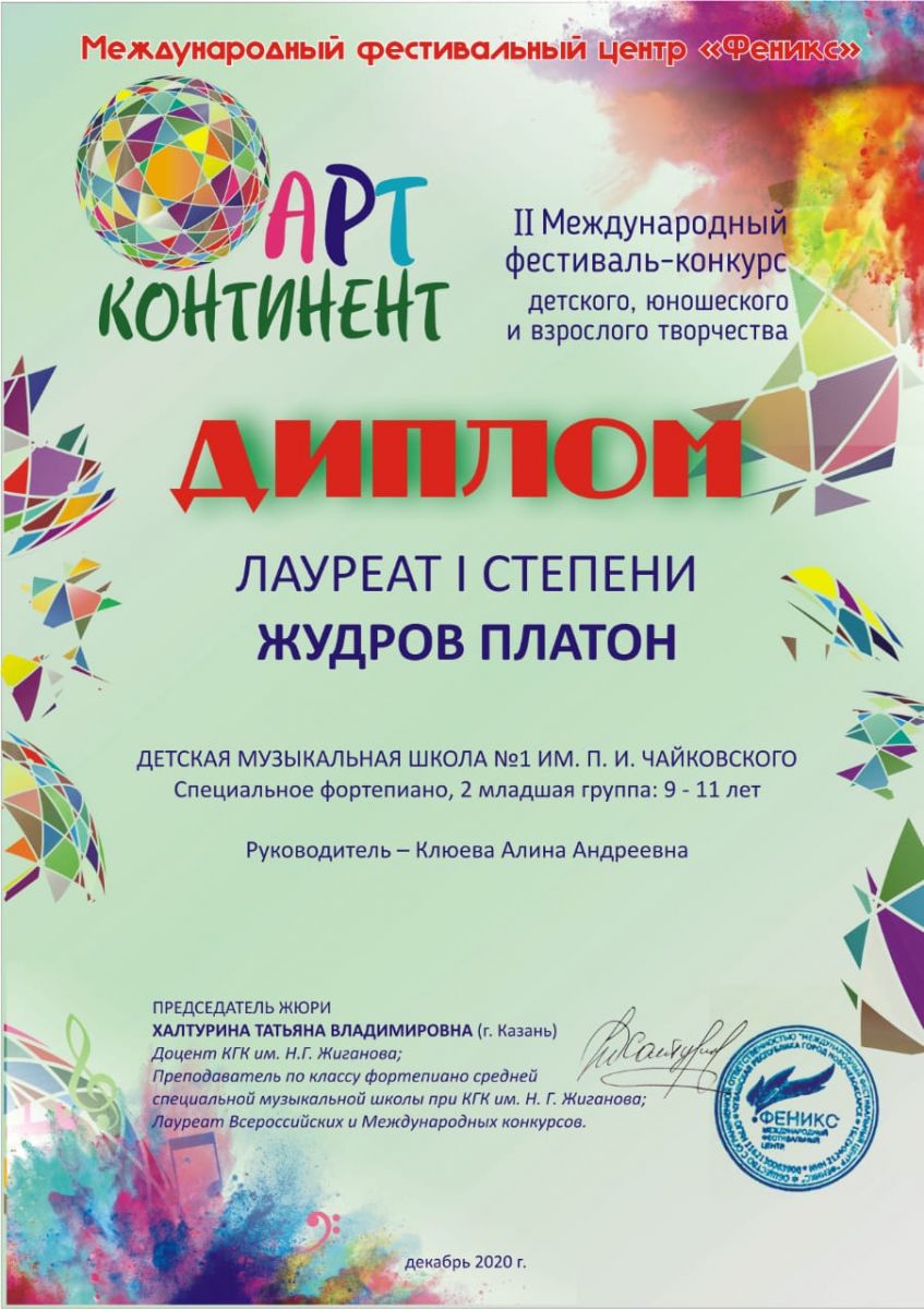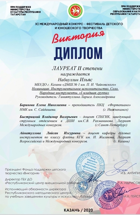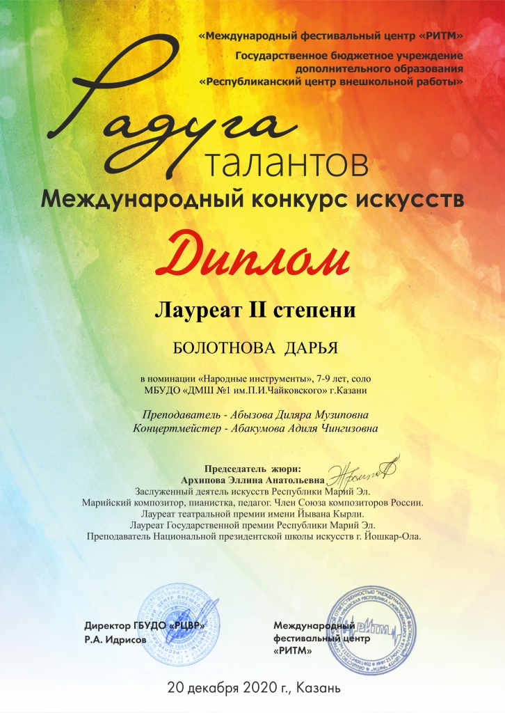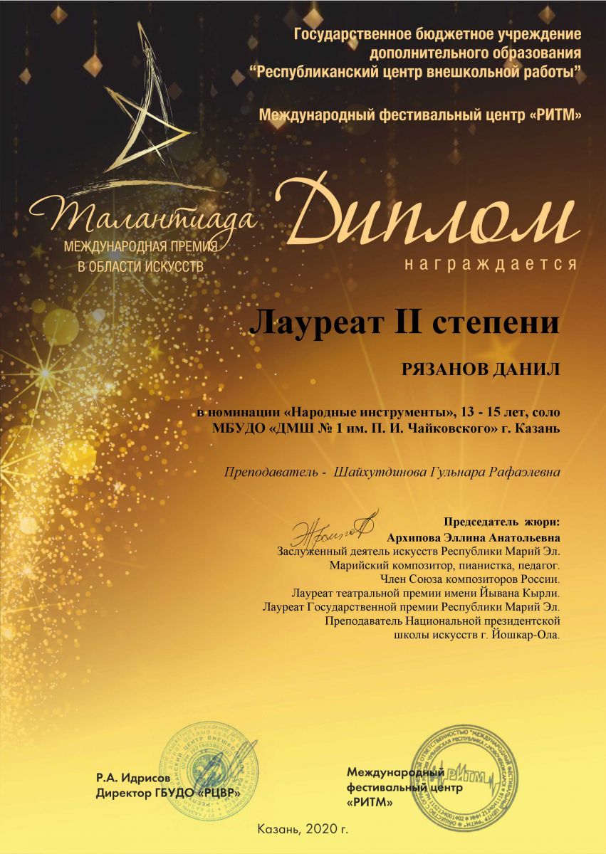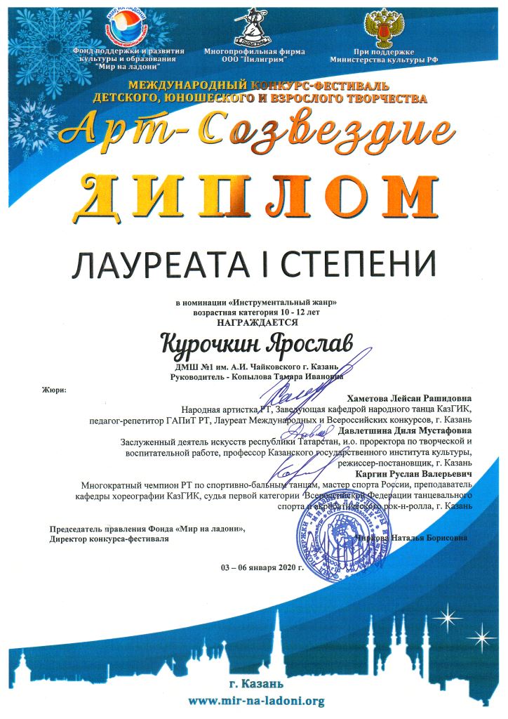 Международный конкурс "ART Весна" - Рязанов Данил, Лауреат II степени, класс Шайхутдиновой Г.Р.;