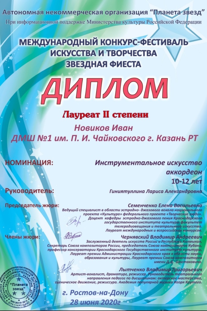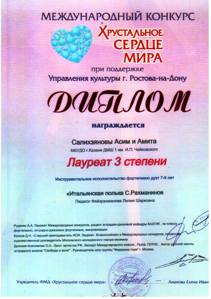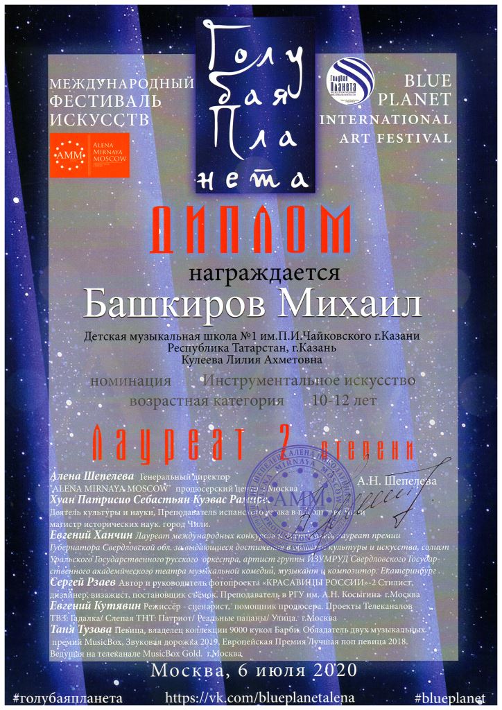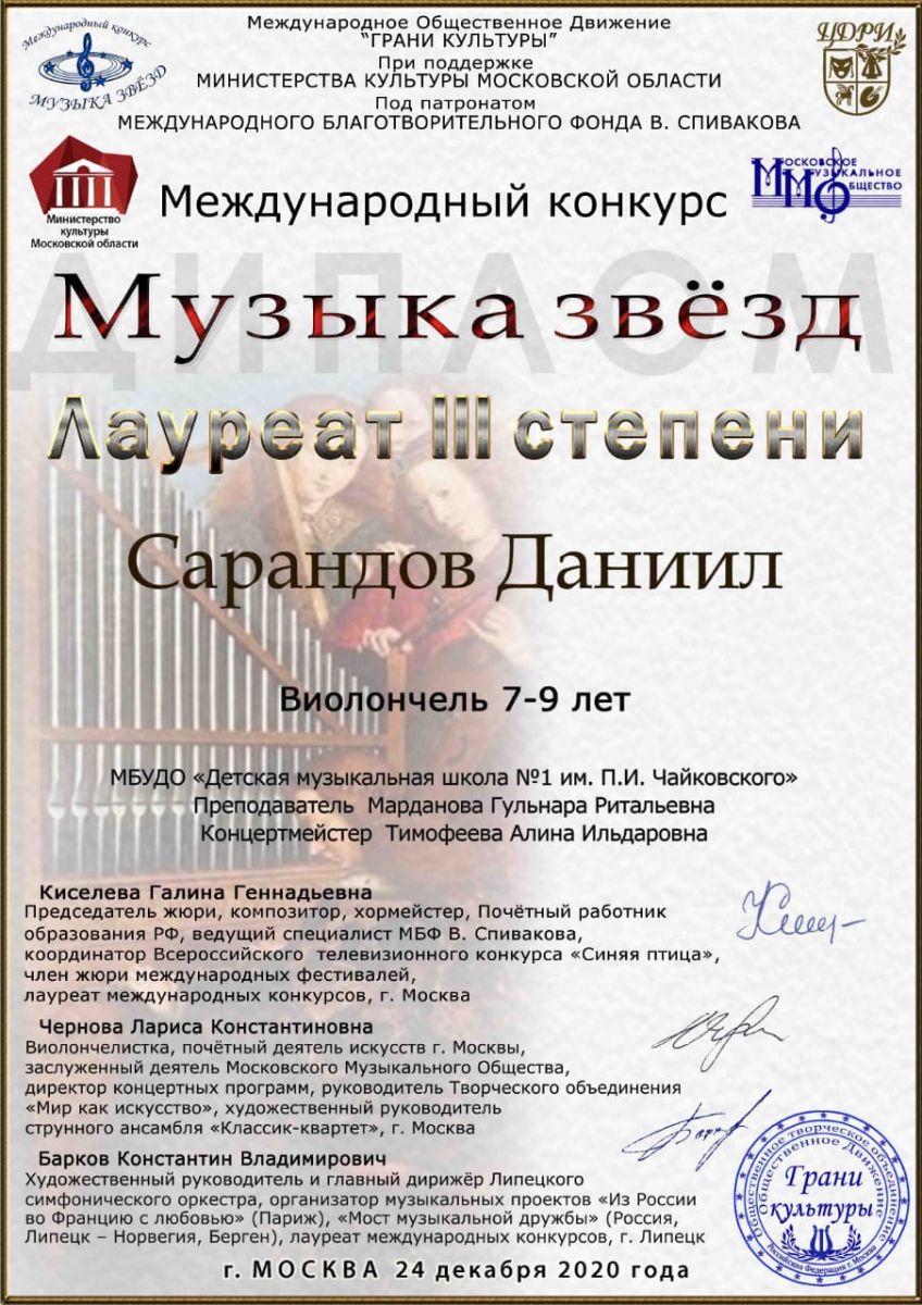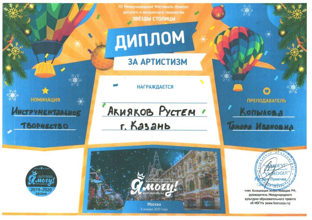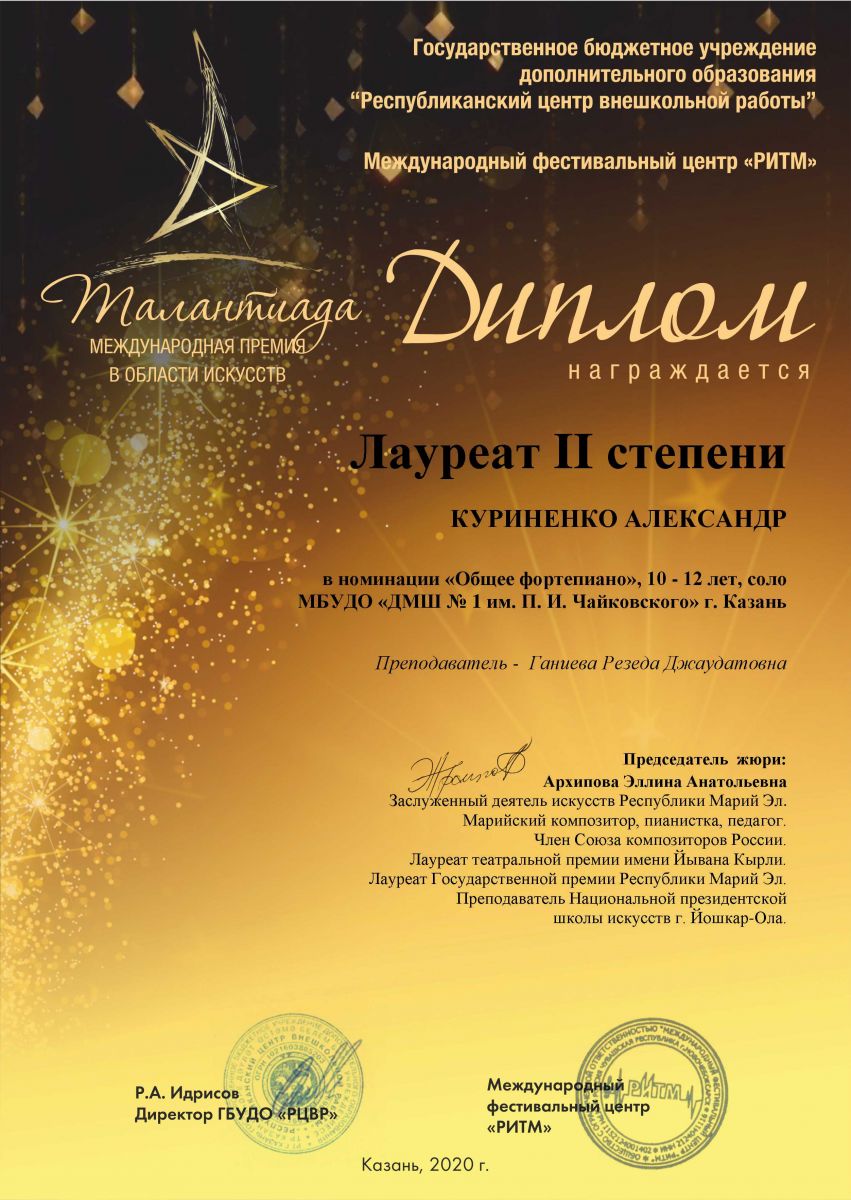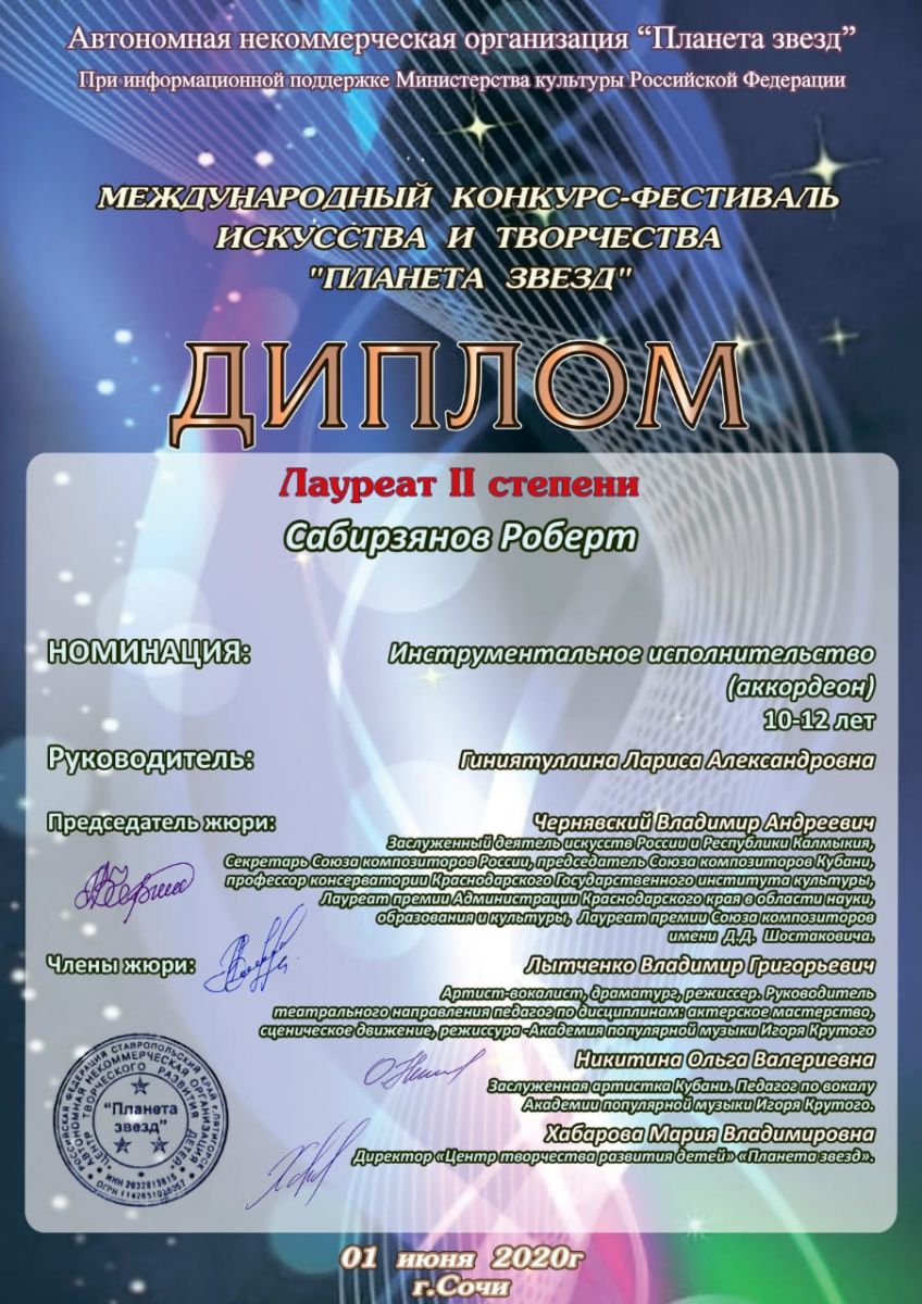 Международный конкурс "ART Весна" - Рязанов Данил, Лауреат II степени, класс Шайхутдиновой Г.Р.;