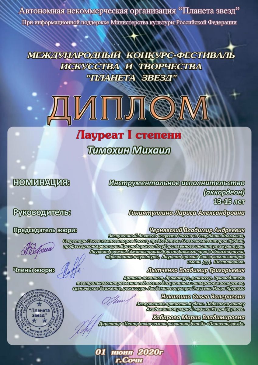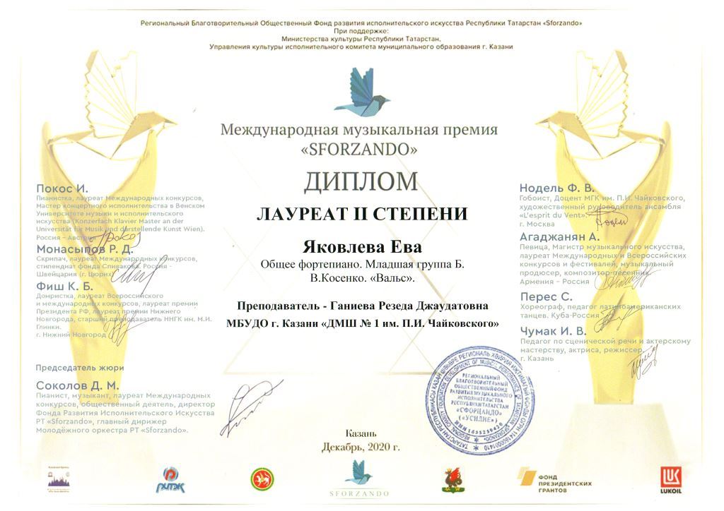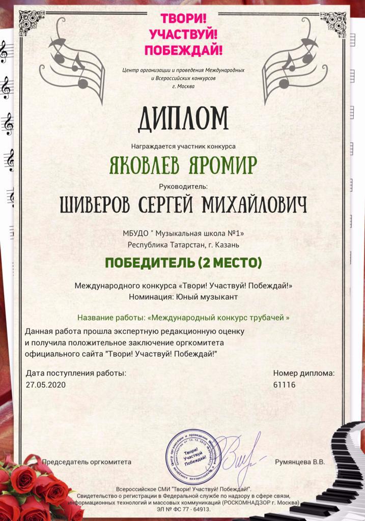 Международный конкурс "Твори, участвуй, побеждай" - Яковлев Яромир, II место, класс Шиверова С.М.;