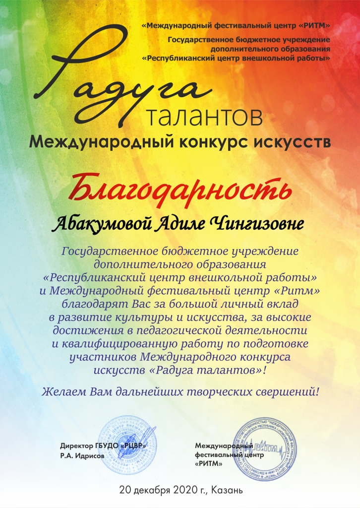 Международный конкурс искусств "Радуга талантов" - Благодарность Абакумовой А.Ч.;