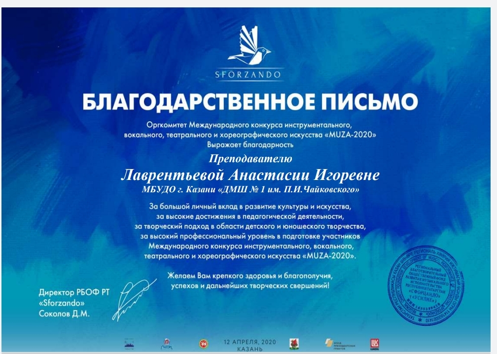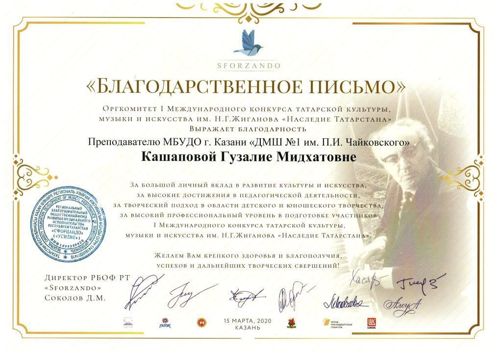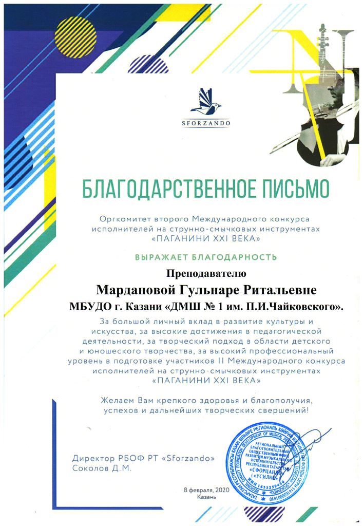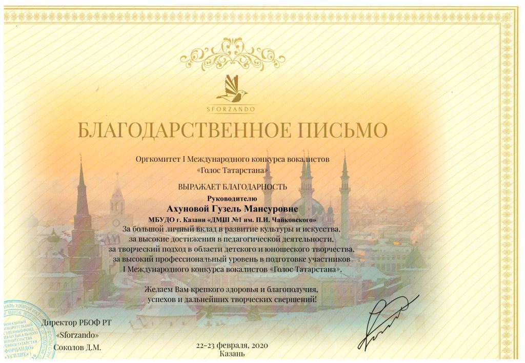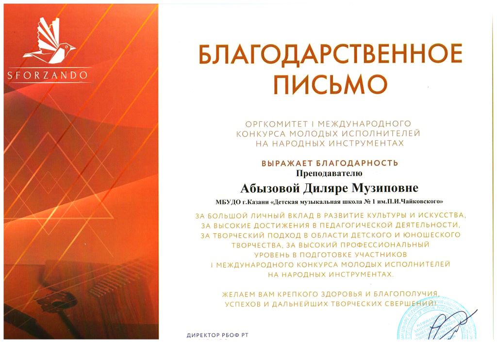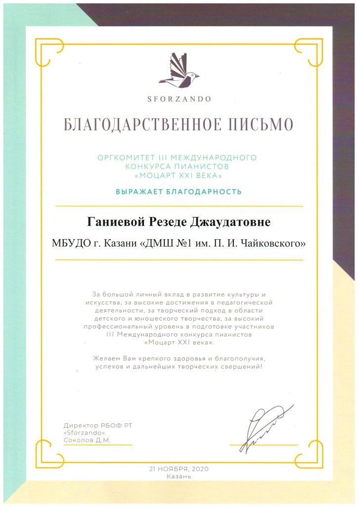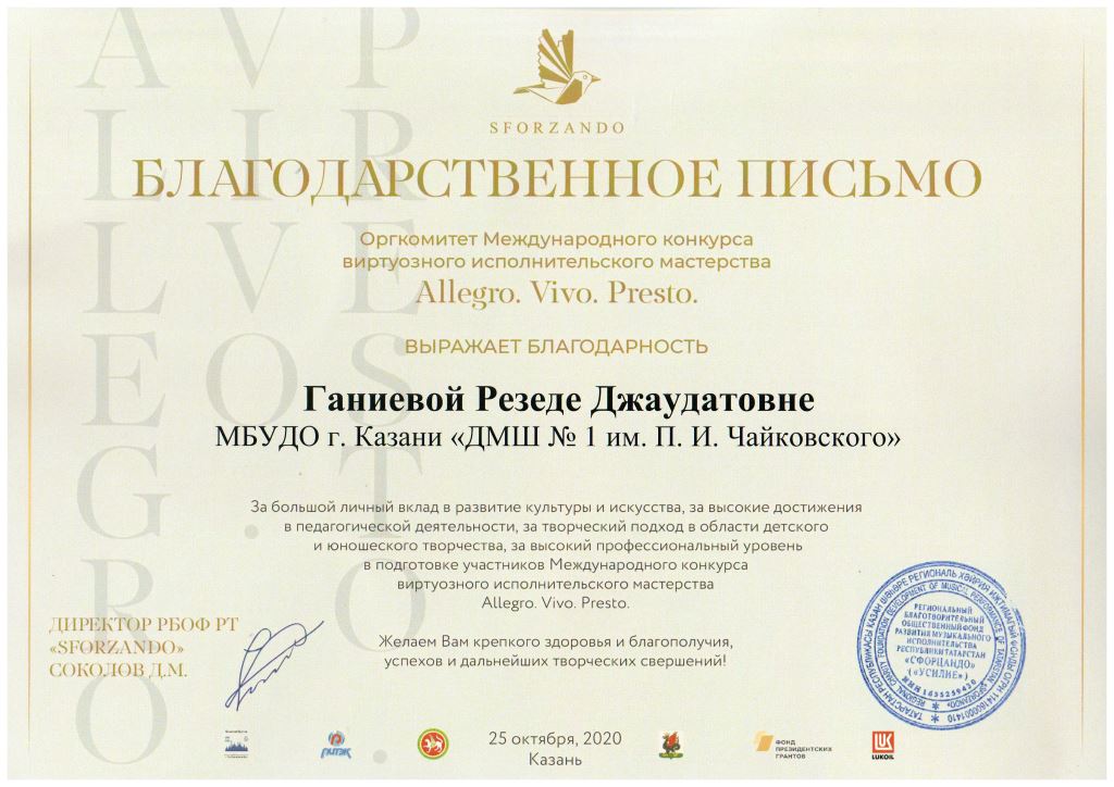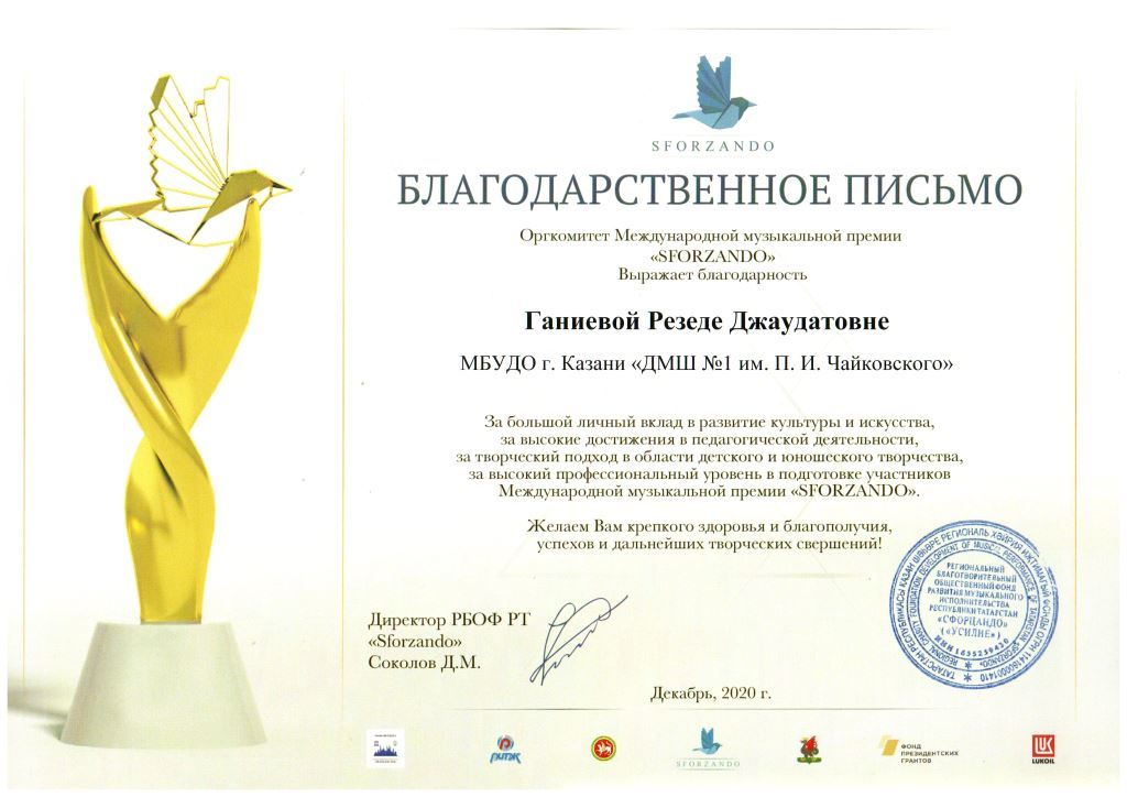 Международная музыкальная премия "SFORZANDO" - Благодарственное письмо Ганиевой Р.Д.;