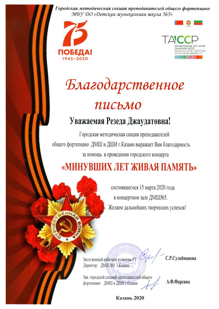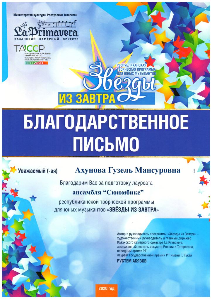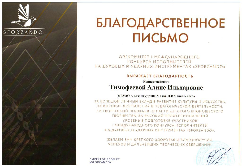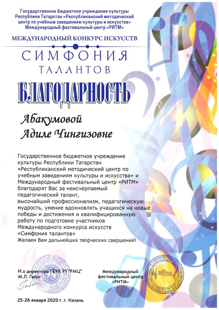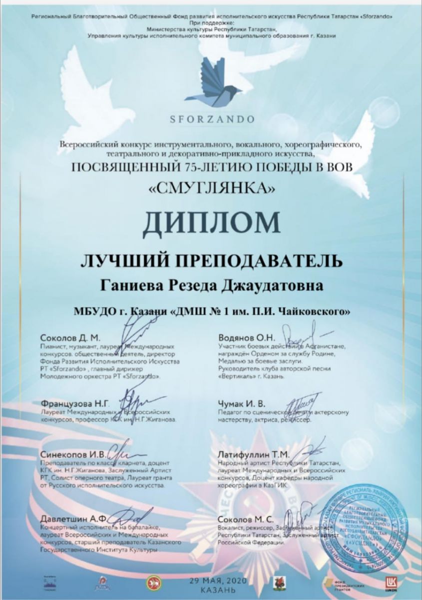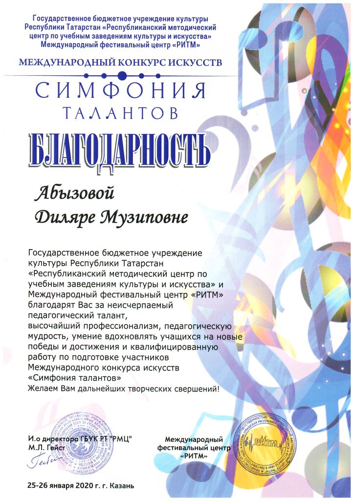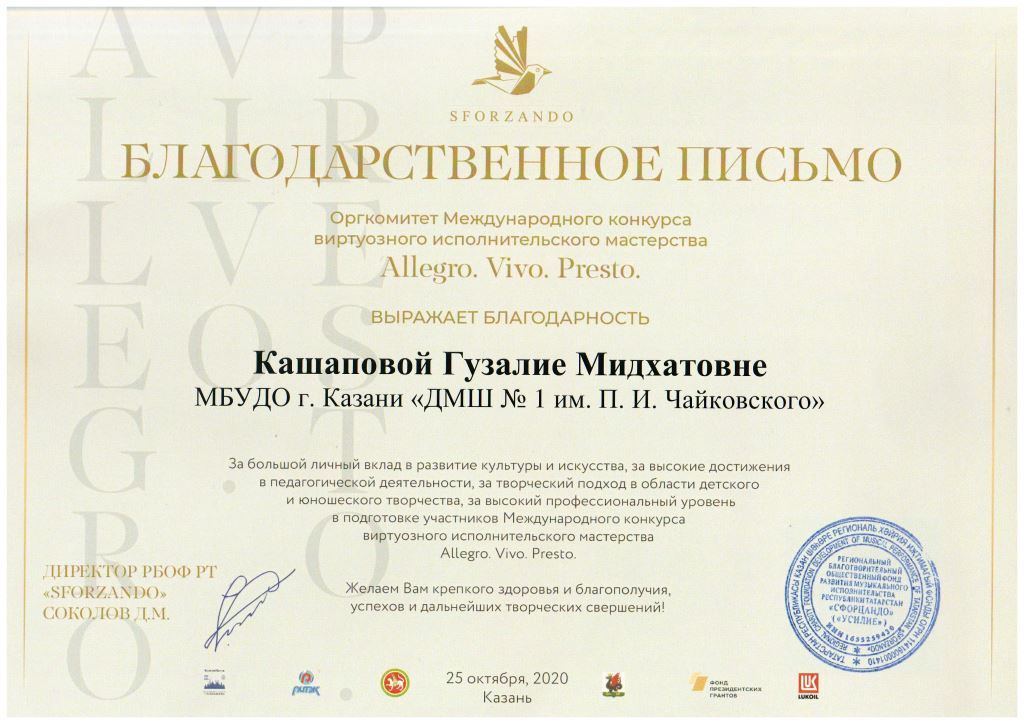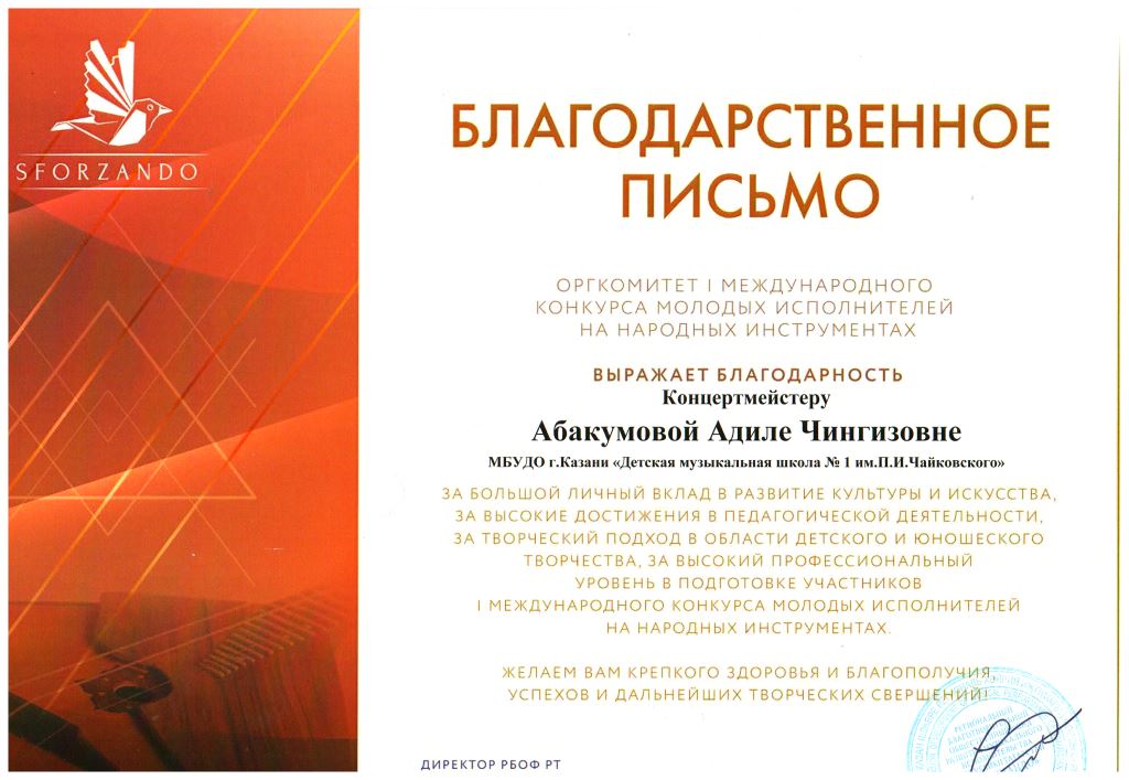 Международная музыкальная премия "SFORZANDO" - Благодарственное письмо Ганиевой Р.Д.;