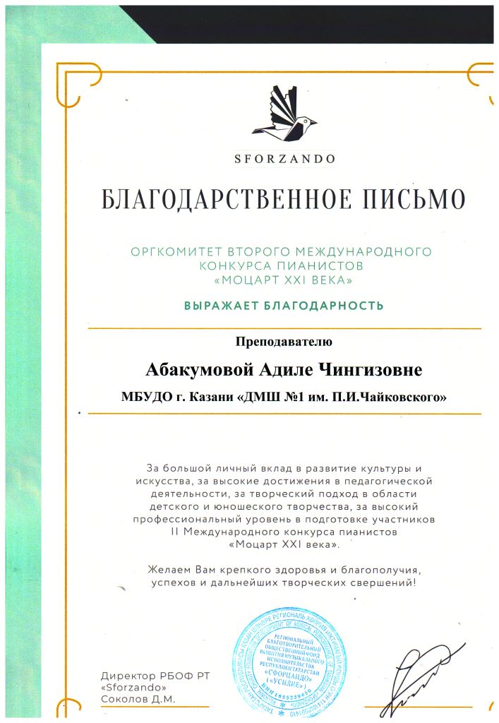 Второй Международный конкурс пианистов "Моцарт XXI века" - Благодарность Абакумовой А.Ч.;