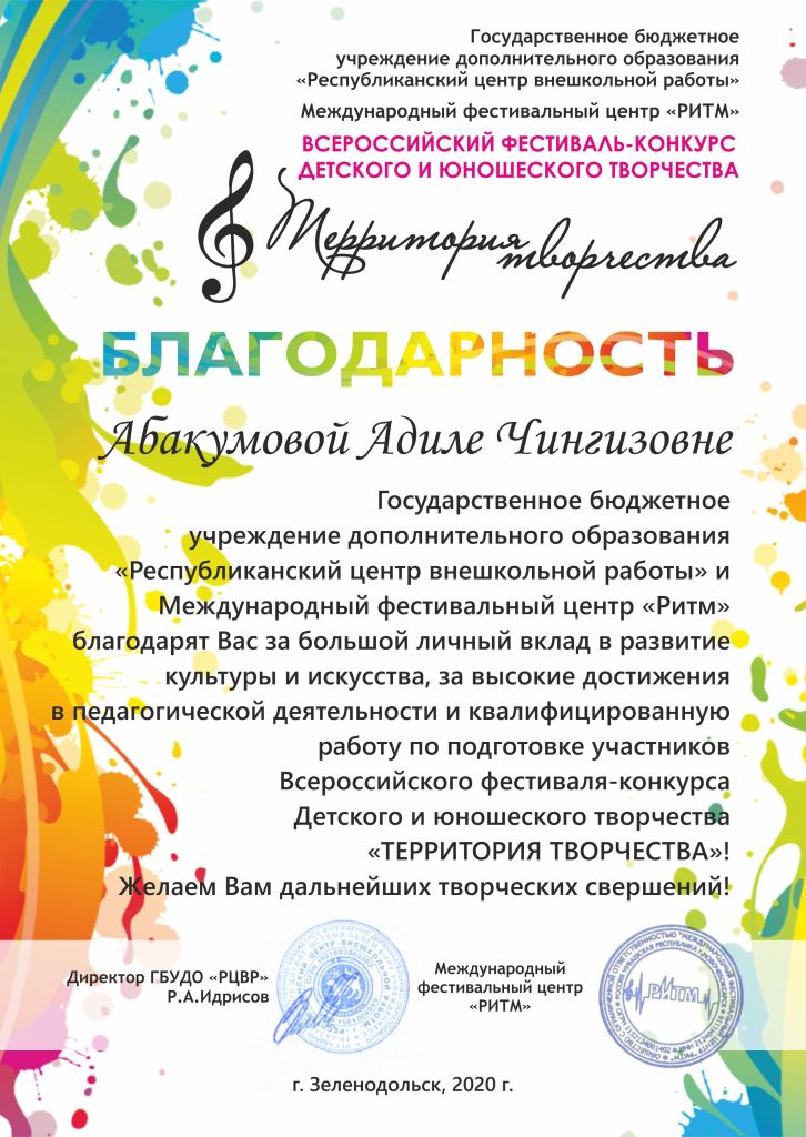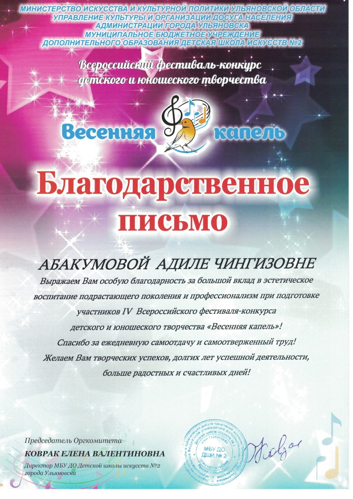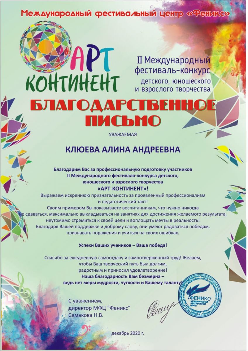 Международный конкурс-фестиваль "Next. Поколение 2020" - Благодарственное письмо Абакумовой А.Ч.;