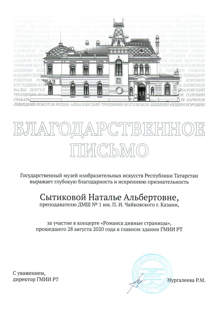 Государственный музей изобразительных искусств РТ - Благодарственное письмо Сытиковой Н.А.;
