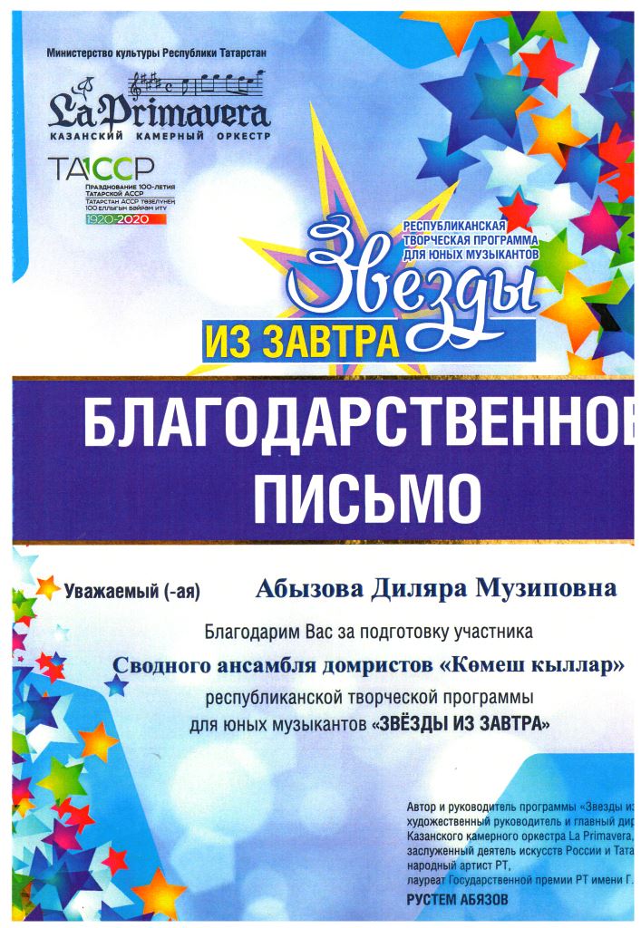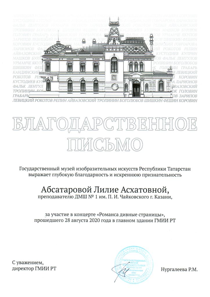 Государственный музей изобразительных искусств РТ - Благодарственное письмо Абсатаровой Л.А.;