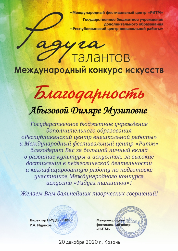 Международный конкурс искусств "Радуга талантов" - Благодарность Абызовой Д.М.;