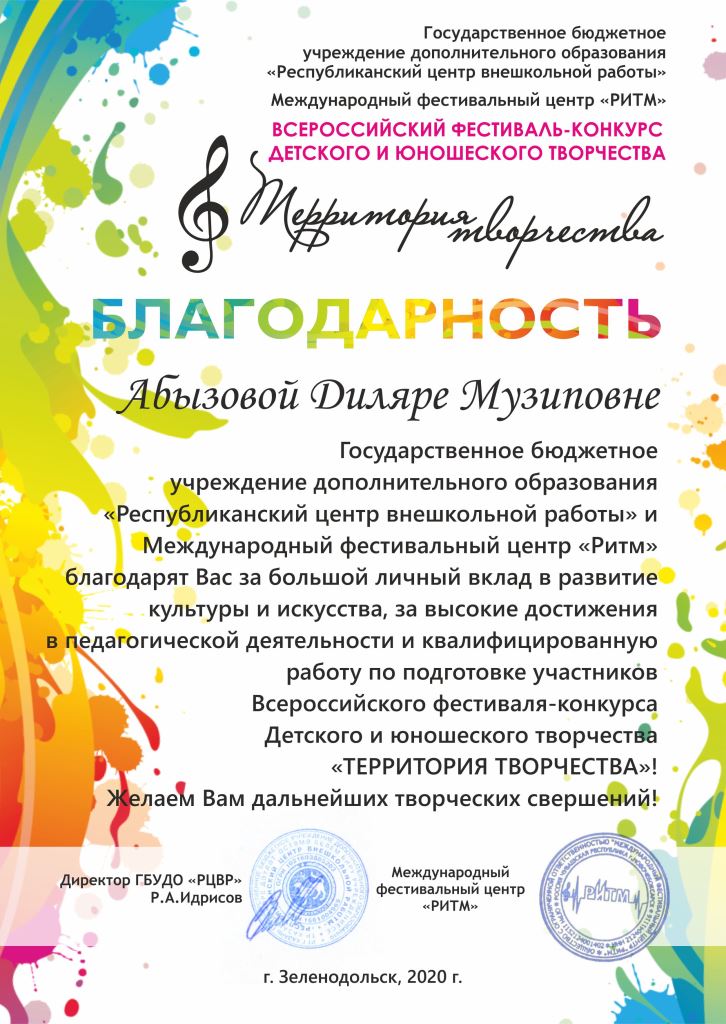 Международный конкурс-фестиваль "Next. Поколение 2020" - Благодарственное письмо Абызовой Д.М.;