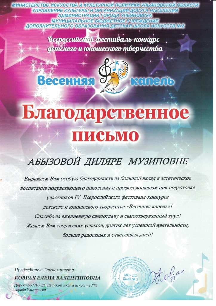 Всероссийский конкурс детского творчества "Юный артист" - Благодарность Абызовой Д.М.;