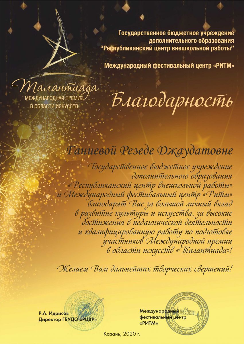 Международная премия в области искусств "Талантиада" - Благодарственное письмо Ганиевой Р.Д.;