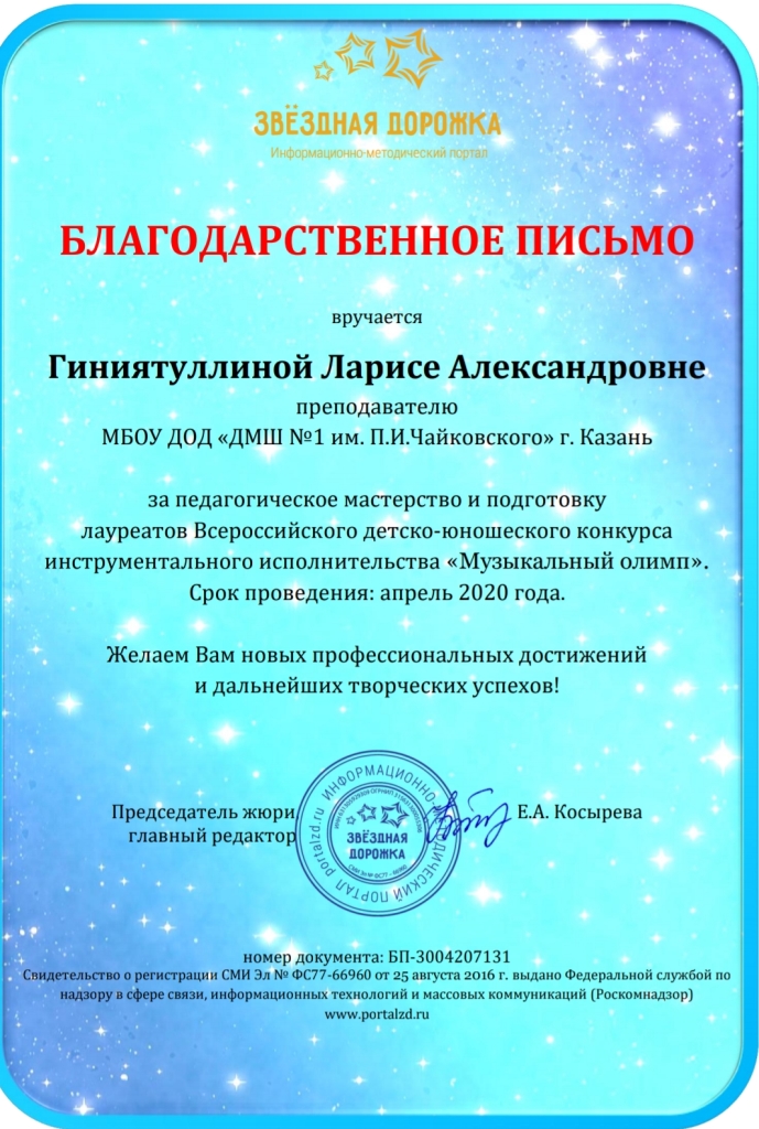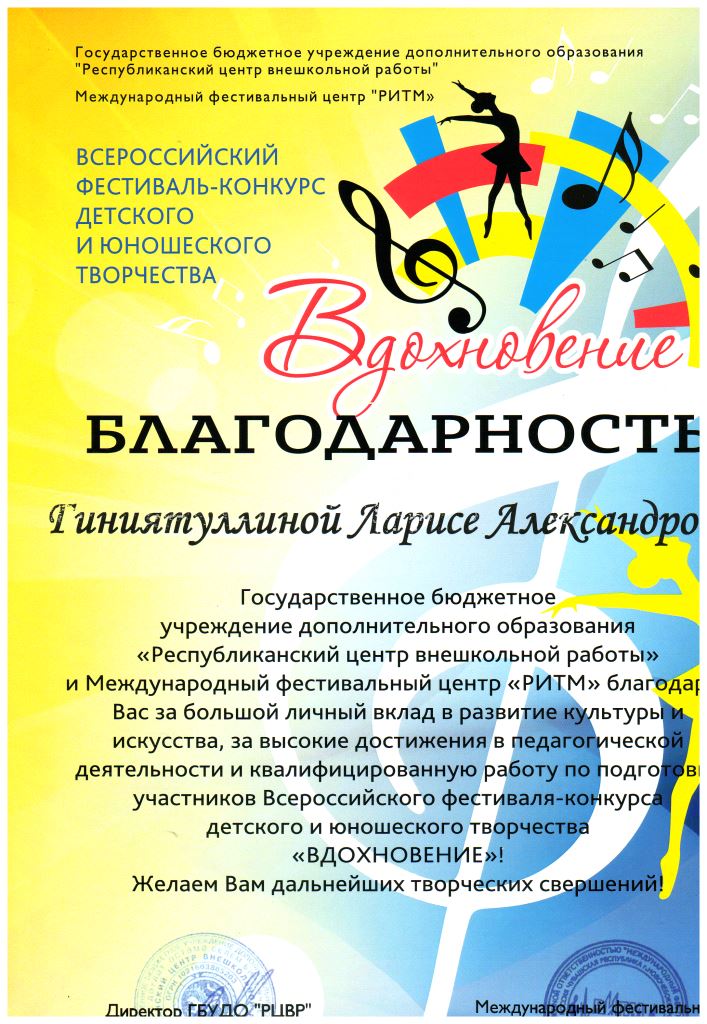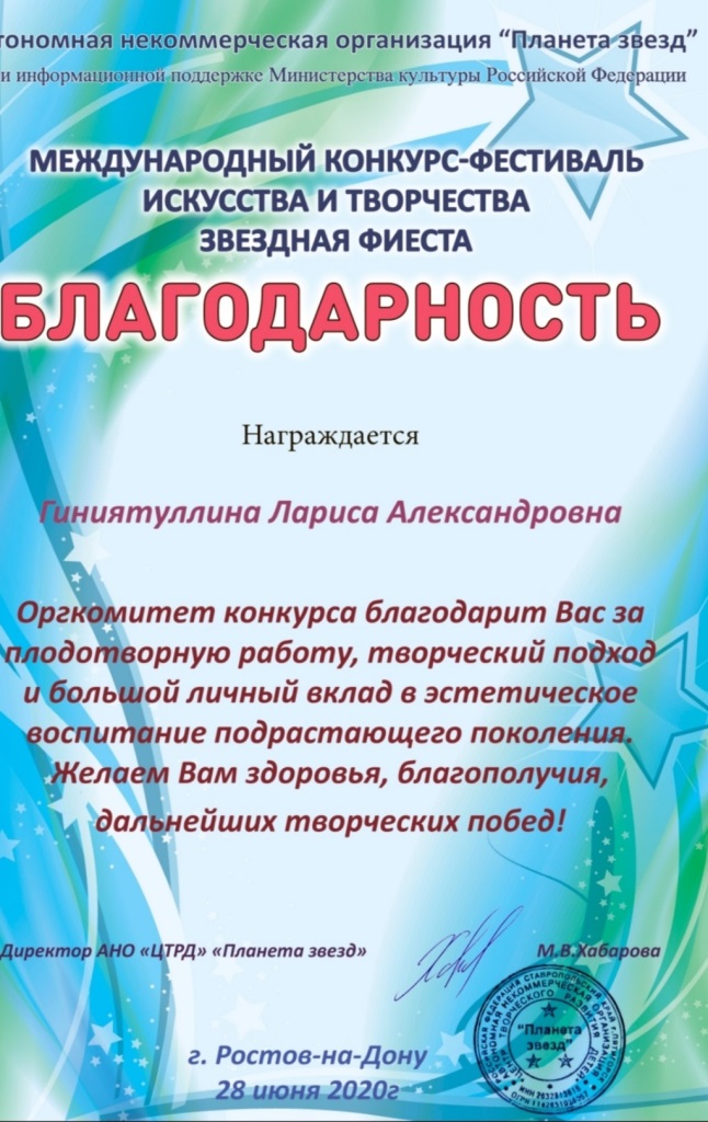 Международный фестиваль искусства и творчества "Планета звёзд" - Благодарность Гиниятуллиной Л.А.;