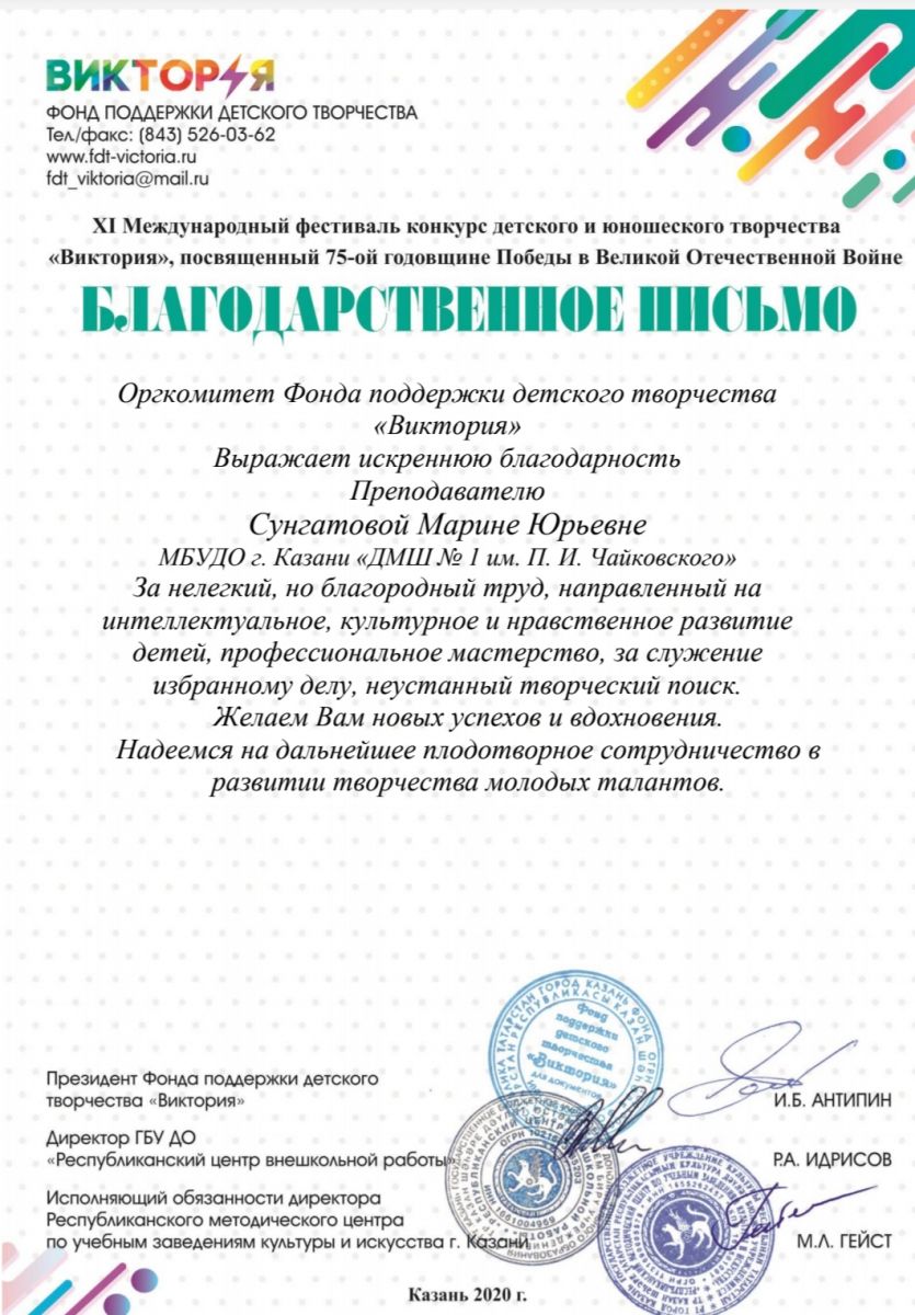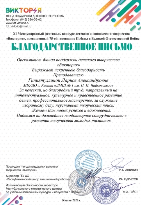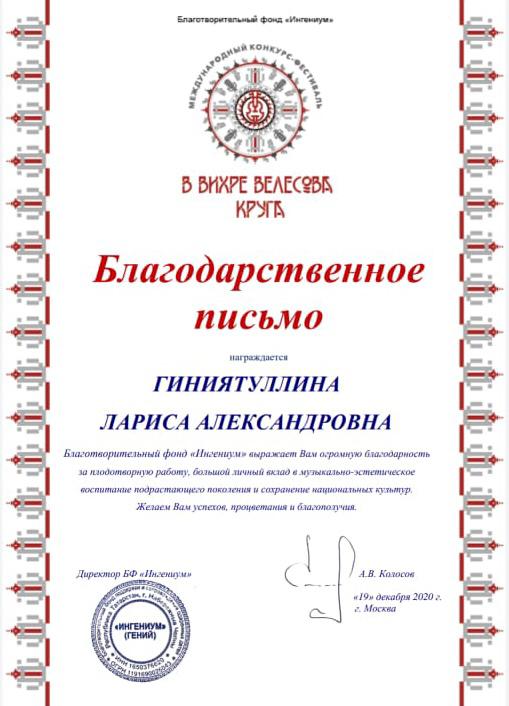 Международный конкурс-фестиваль "Next. Поколение 2020" - Благодарственное письмо Ганиевой Р.Д.;