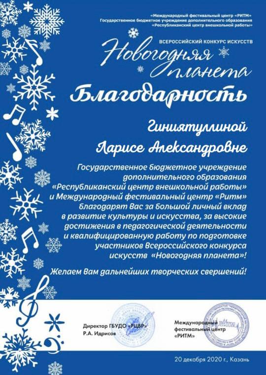 Всероссийский конкурс искусств "Новогодняя планета" - Благодарность Гиниятуллиной Л.А.;
