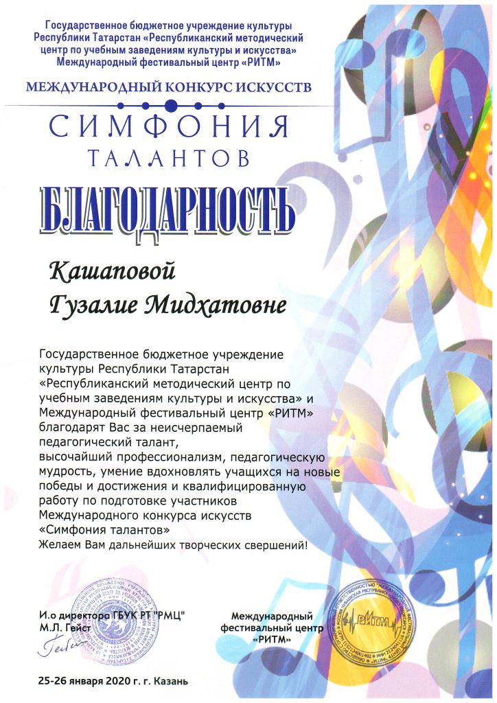 Международный конкурс искусств "Симфония талантов" - Благодарность Кашаповой Г.М.;