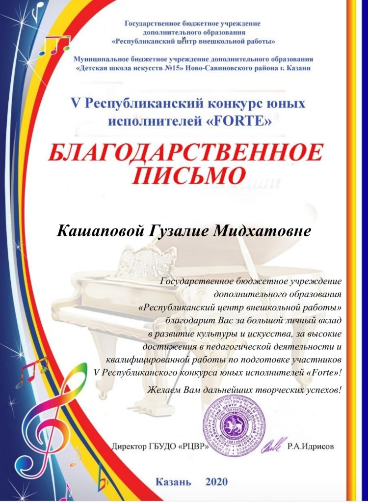V Республиканский конкурс юных исполнителей "Forte" - Благодарность Кашаповой Г.М.;