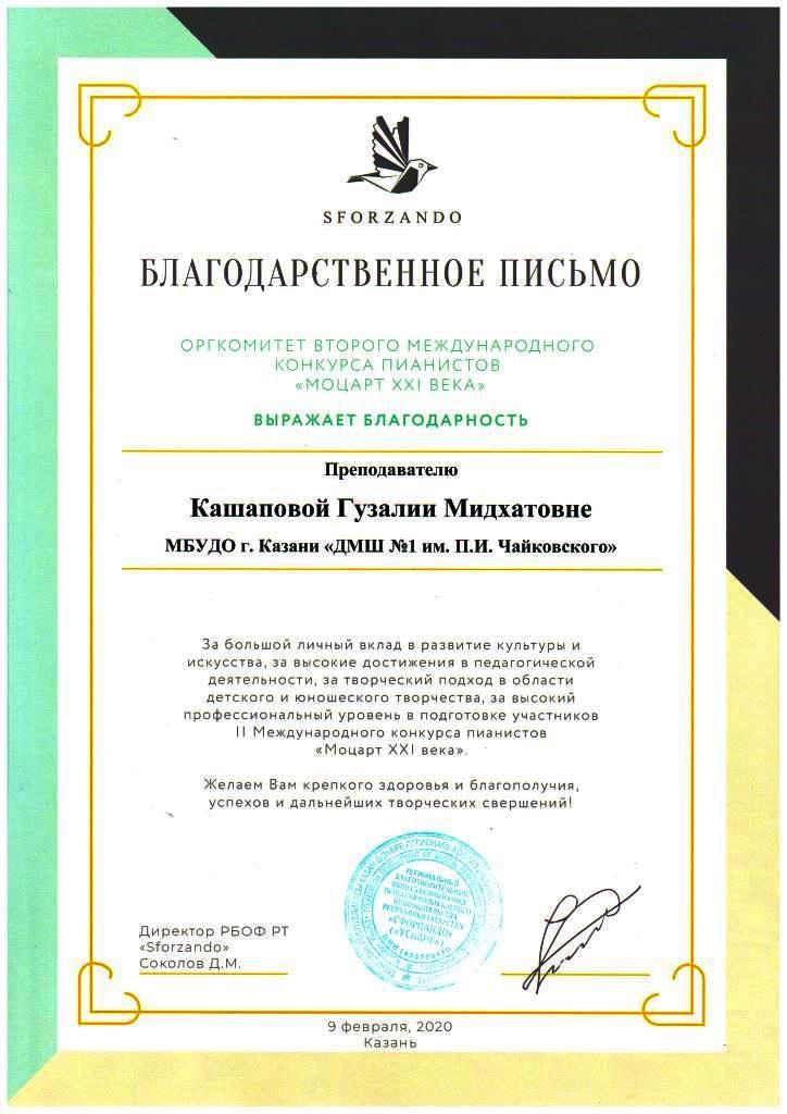 Второй Международный конкурс пианистов "Моцарт XXI века" - Благодарность Кашаповой Г.М.;