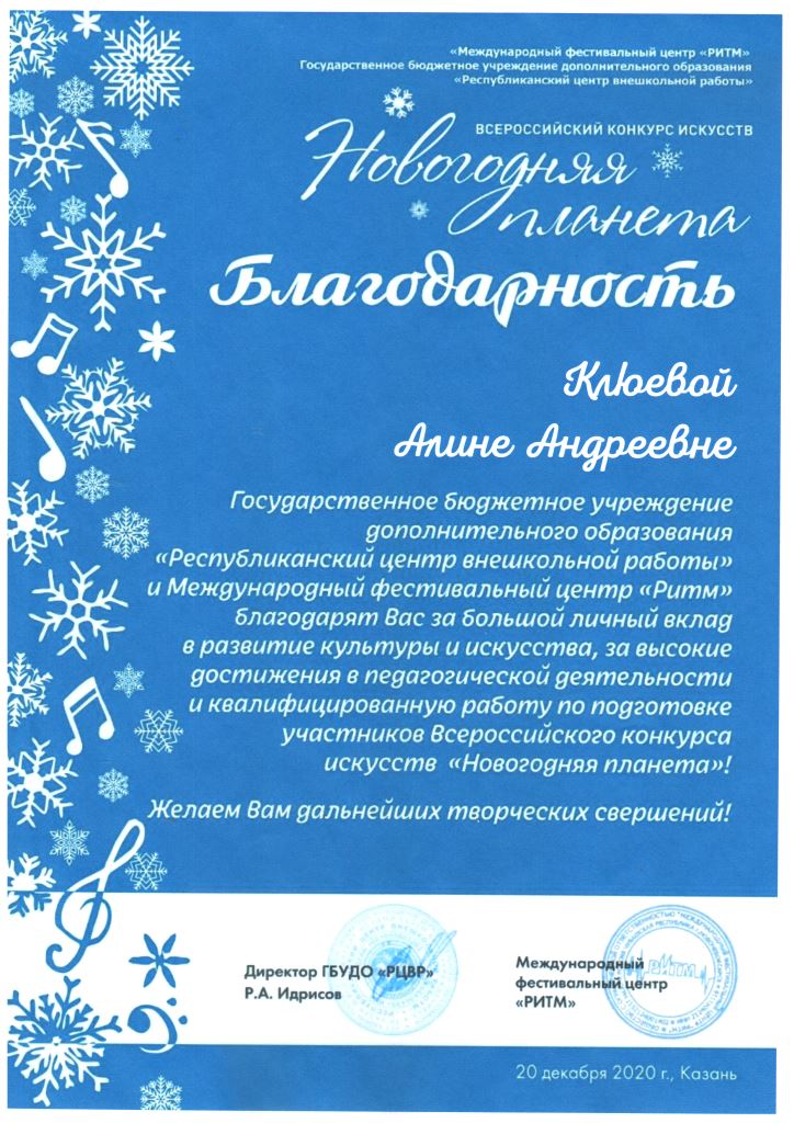 Всероссийский конкурс искусств "Новогодняя планета" - Благодарность Клюевой А.А.;