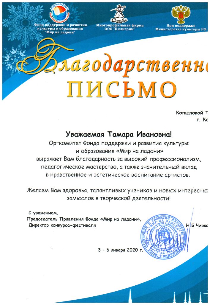 Фонд поддержки и развития культуры "Мир на ладони" - Благодарственное письмо Копыловой Т.И.;