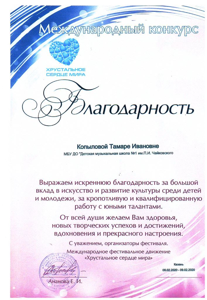 Международный конкурс "Хрустальное сердце мира" - Благодарность Копыловой Т.И.;