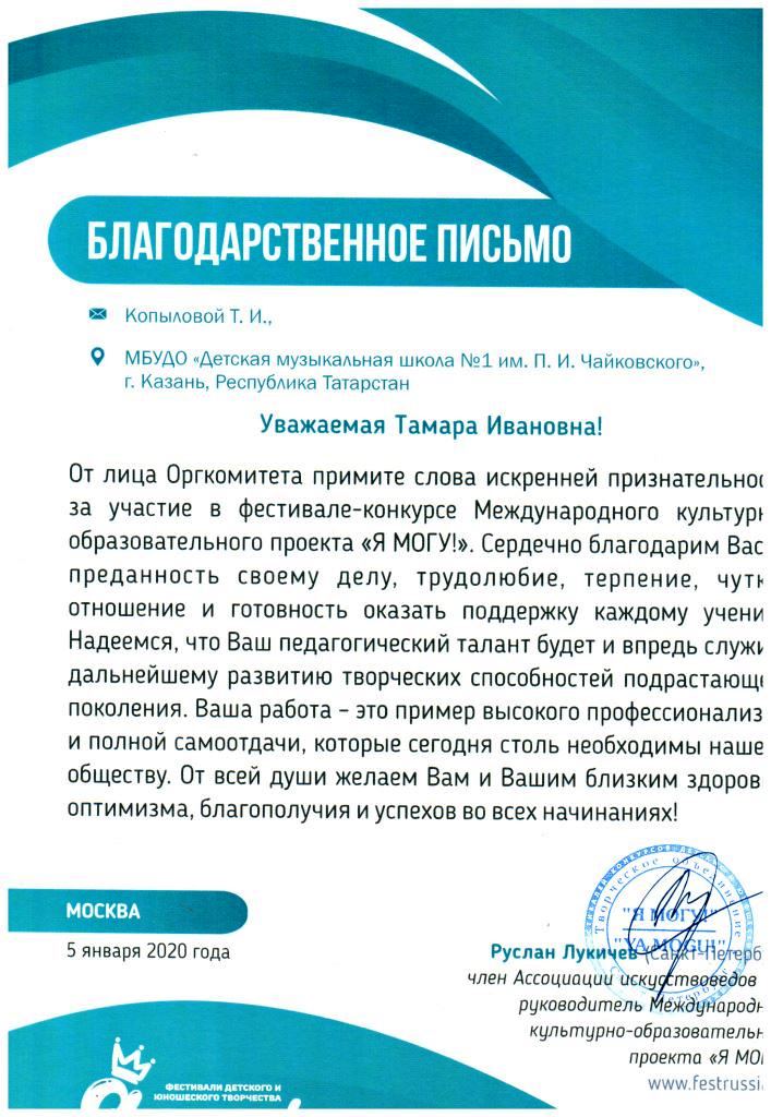 Международный культурно-образовательный проект "Я могу!" - Благодарственное письмо Копыловой Т.И.;