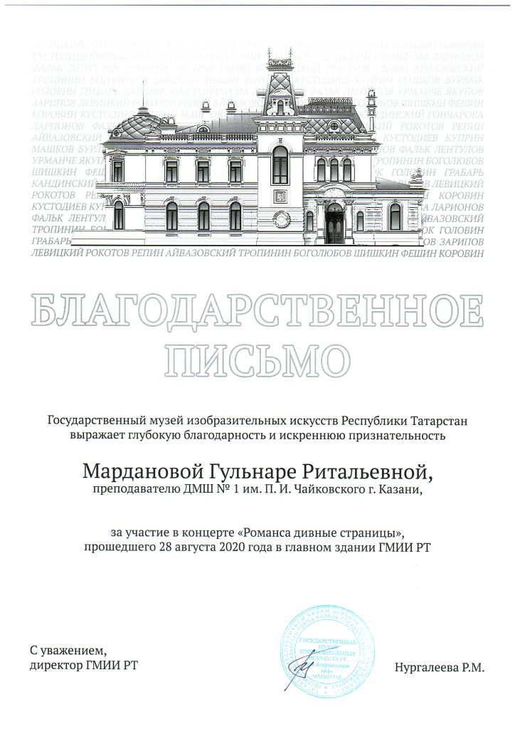 Государственный музей изобразительных искусств РТ - Благодарственное письмо Мардановой Г.Р.;