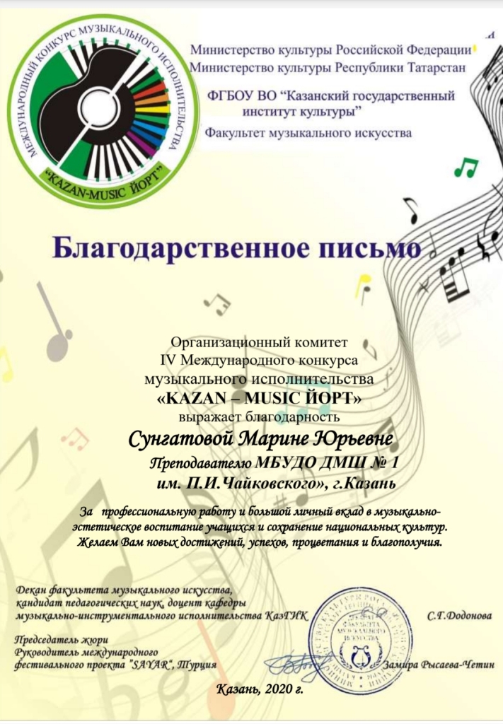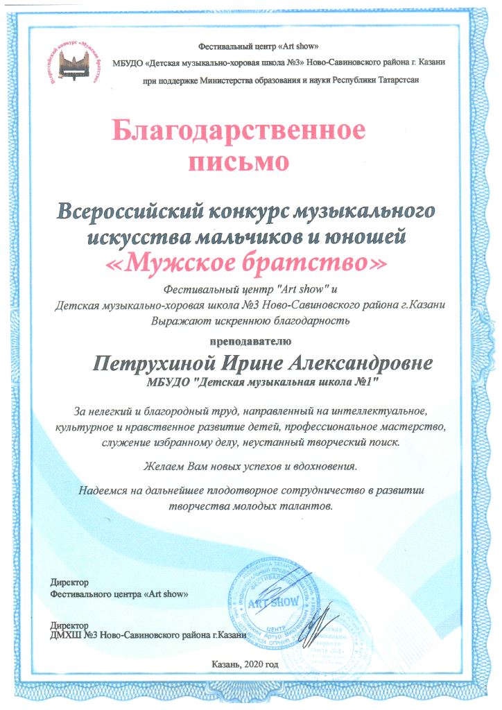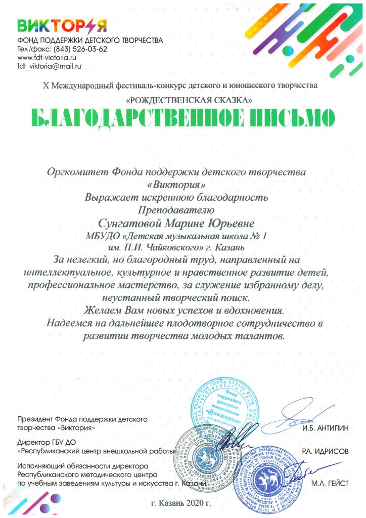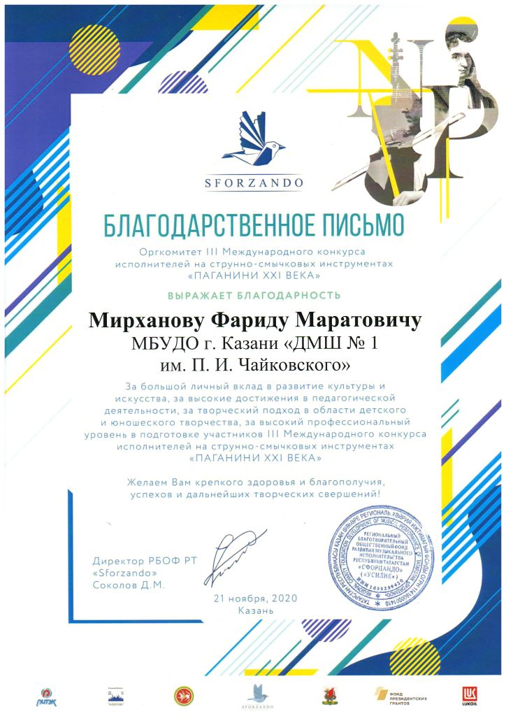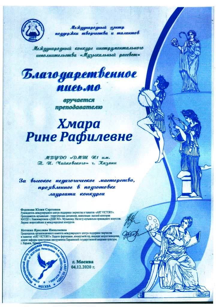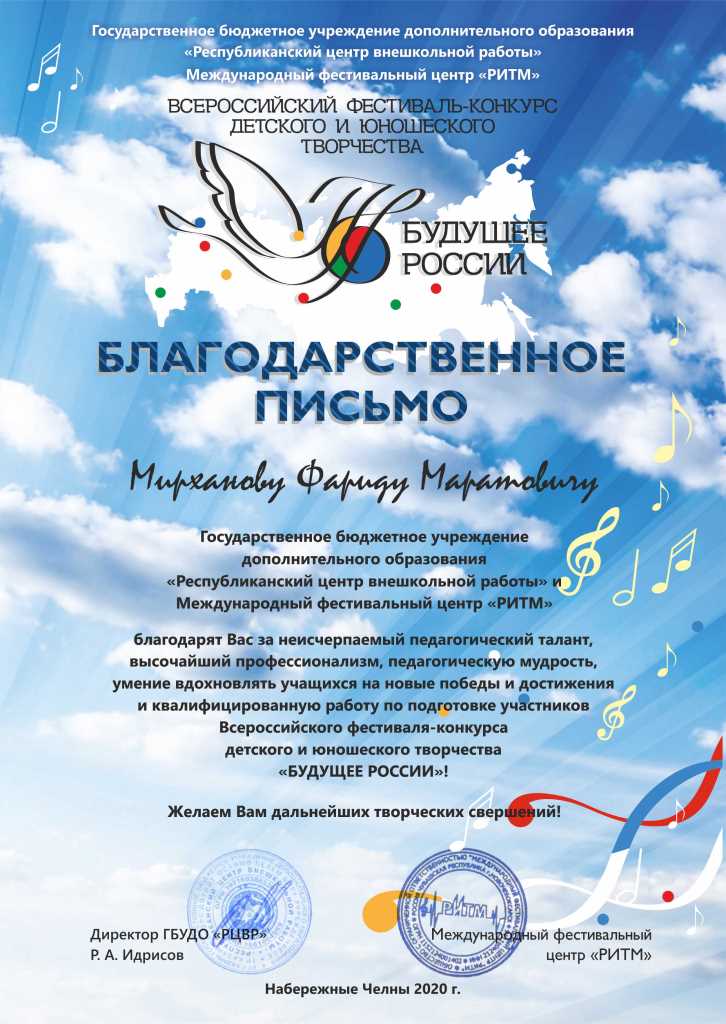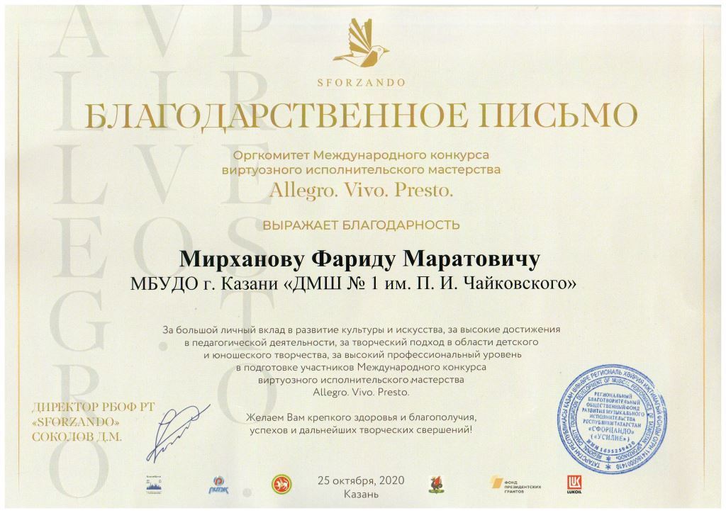 Международный конкурс-фестиваль "Next. Поколение 2020" - Благодарственное письмо Мирханову Ф.М.;