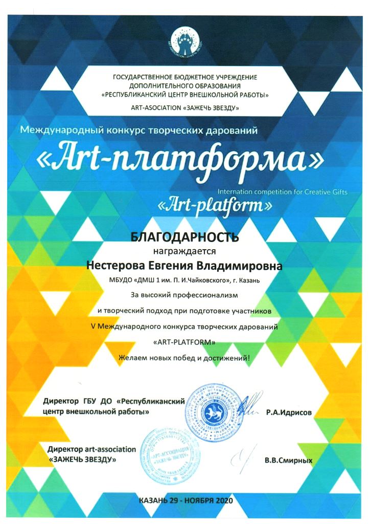 Международный конкурс творческих дарований "Art-платформа" - Благодарность Нестеровой Е.В.;