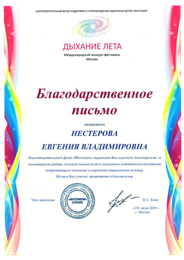 Международный конкурс-фестиваль "Дыхание лета" - Благодарность.Нестеровой Е.В.;