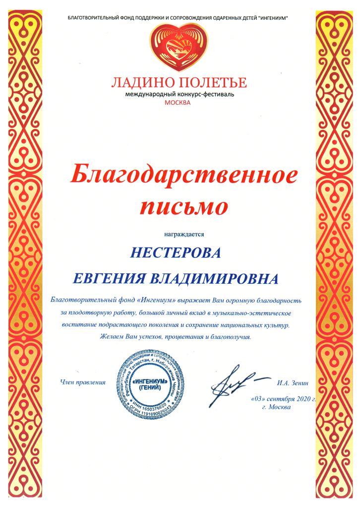 Международный конкурс-фестиваль "Ладино полетье" - Благодарность Нестеровой Е.В.;