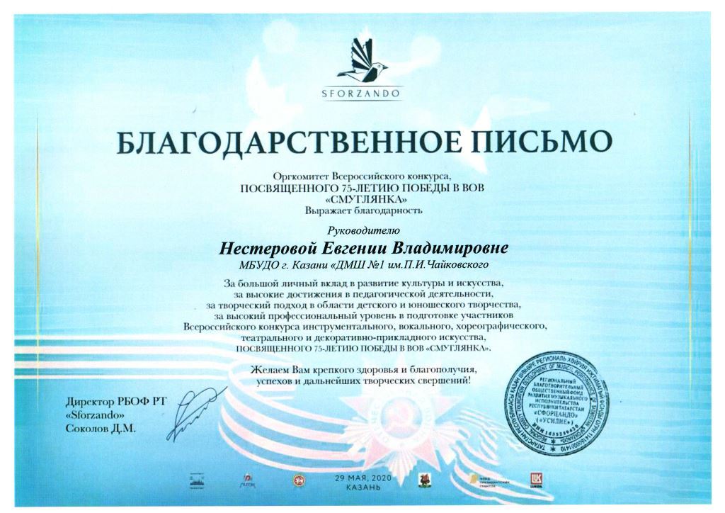 Всероссийский конкурс "Смуглянка" - Благодарственное письмо Нестеровой Е.В.;