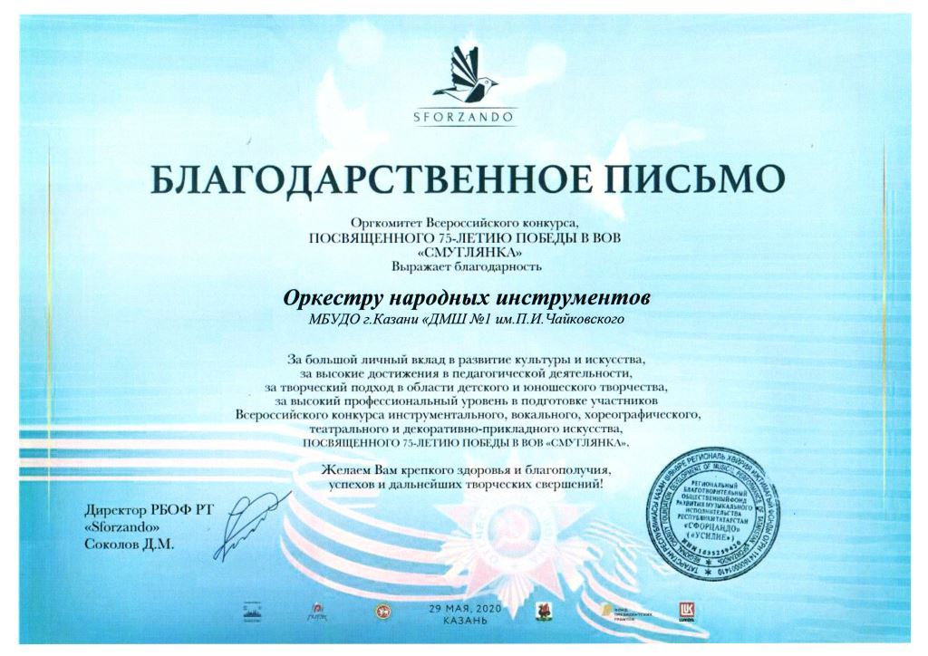 Всероссийский конкурс "Смуглянка" - Благодарственное письмо Оркестру народных инструментов;