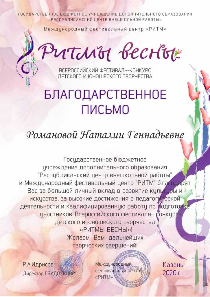 Международный конкурс-фестиваль "Next. Поколение 2020" - Благодарственное письмо Романовой Н.Г.;