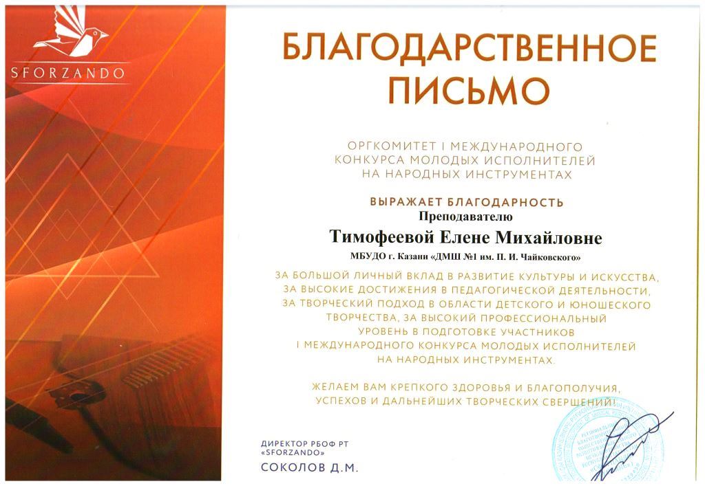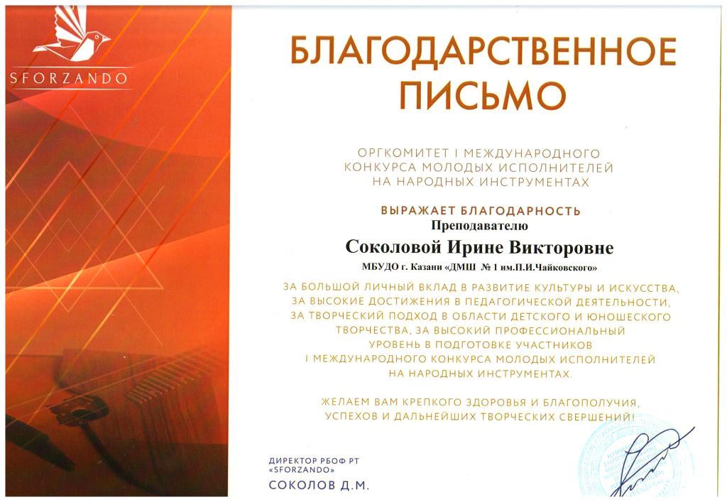 I Международный конкурс исполнителей на народных инструментах "SFORZANDO" - Благодарственное письмо Петрухиной И.А.;