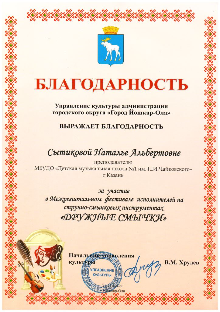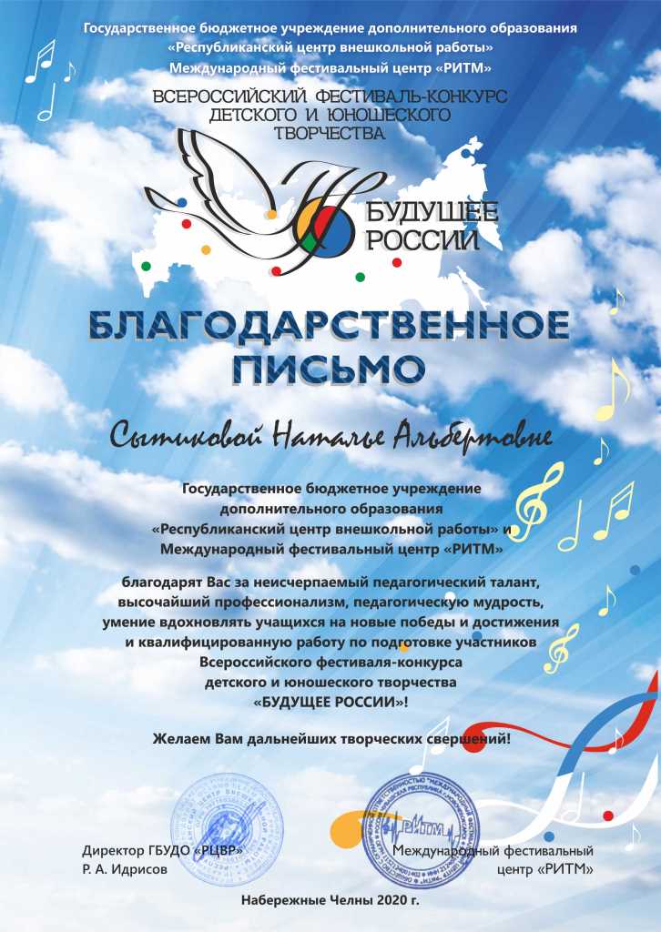 Международный конкурс-фестиваль "Next. Поколение 2020" - Благодарственное письмо Сытиковой Н.А.;