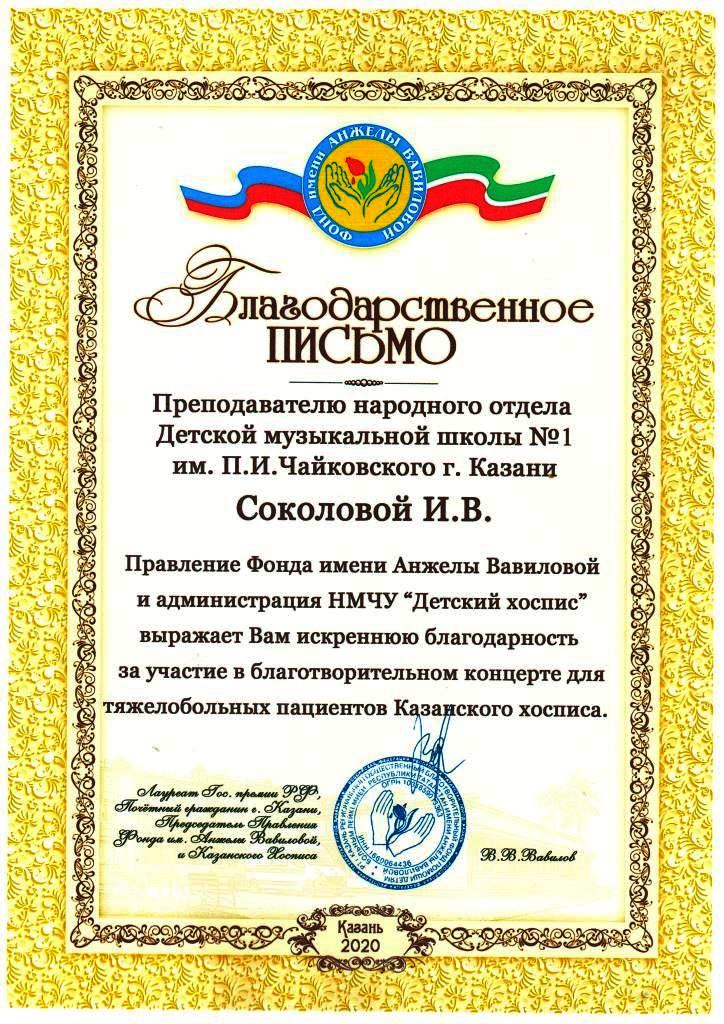 Фонд Анжелы Вавиловой и администрация НМЧУ "Детский хоспис" - Благодарность Соколовой И.В.;