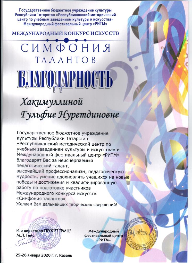 Международный конкурс искусств "Симфония талантов" - Благодарность Хакимуллиной Г.Н.;