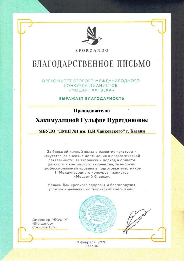 Второй Международный конкурс пианистов "Моцарт XXI века" - Благодарность Хакимуллиной Г.Н.;