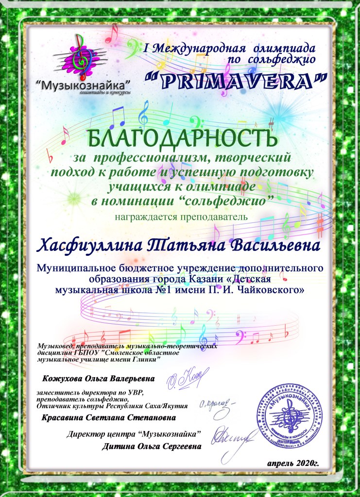 I Международная олимпиада по сольфеджио "Primavera" - Благодарность Хасфиуллиной Т.Н.;