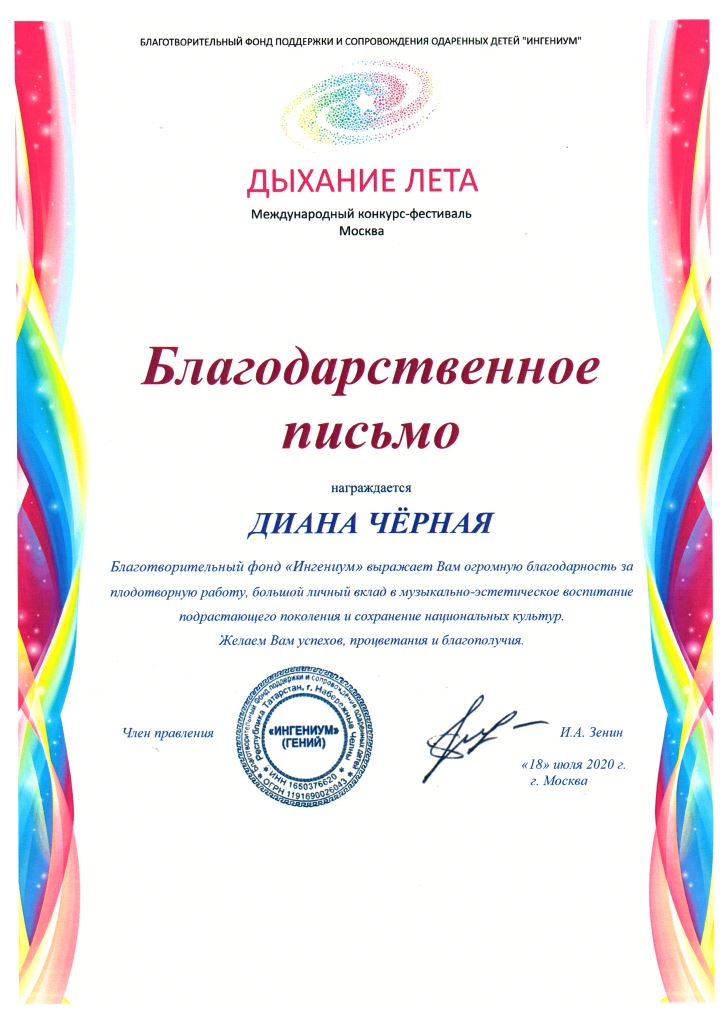 Международный конкурс-фестиваль "Дыхание лета" - Благодарность Черной Д.В.;