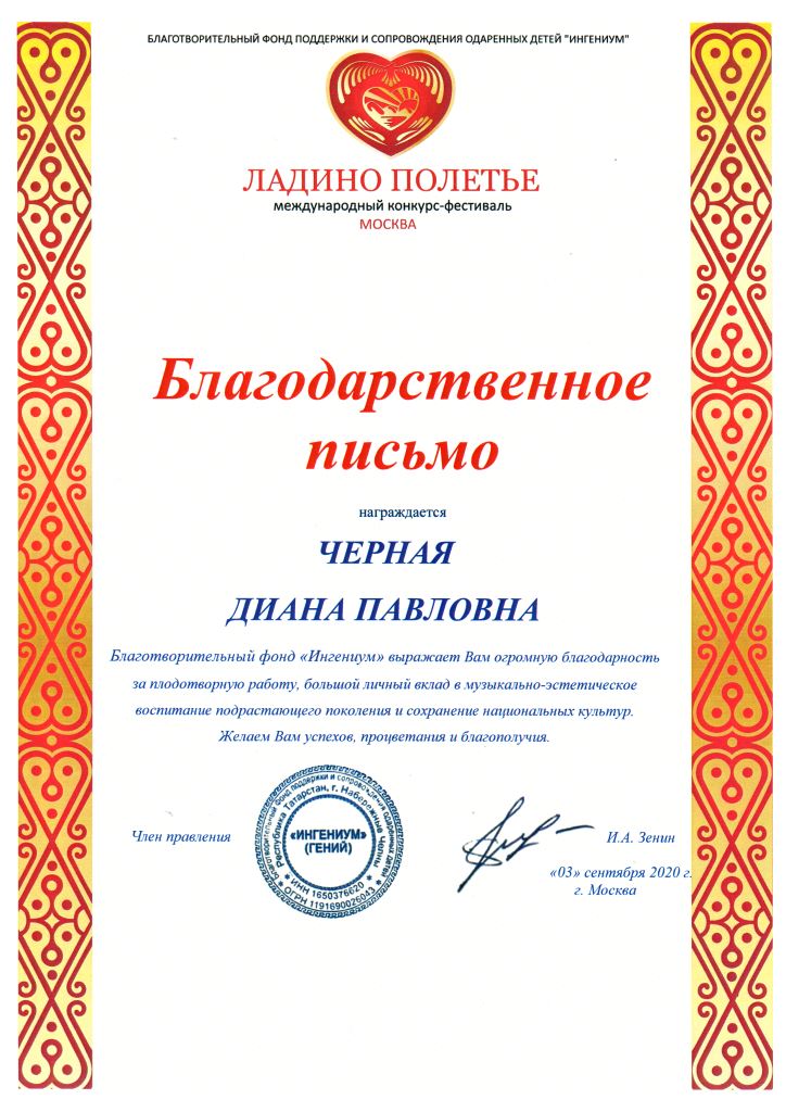 Международный конкурс-фестиваль "Ладино полетье" - Благодарность Черной Д.В.;