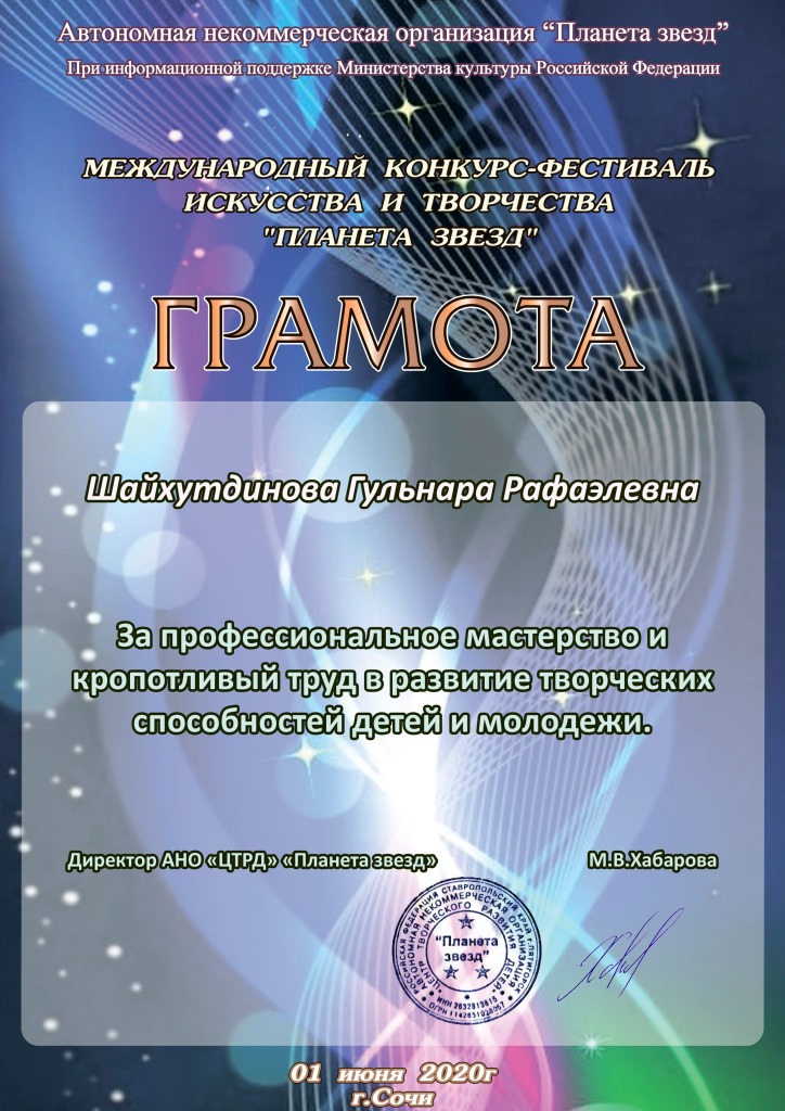 Международный фестиваль искусства и творчества "Планета звёзд" - Благодарность Шайхутдиновой Г.Р.;