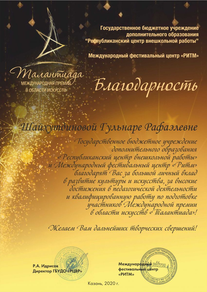 Международная премия в области искусств "Талантиада" - Благодарственное письмо Шайхутдиновой Г.Р.;