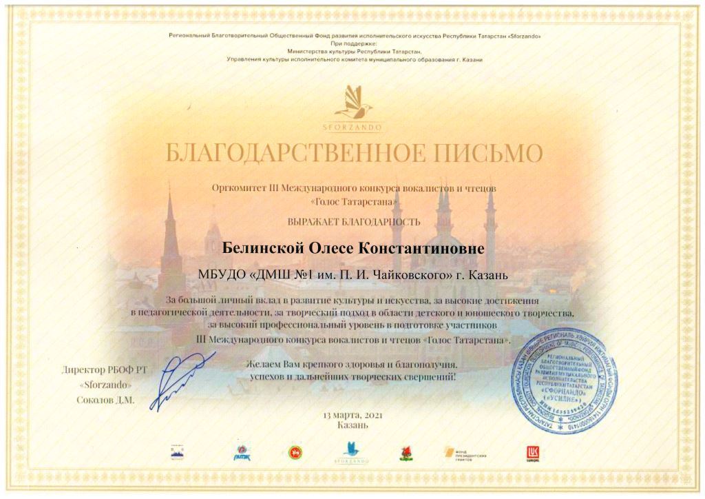III Международный конкурс вокалистов и чтецов "Голос Татарстана" - Благодарность Белинской О.К.;